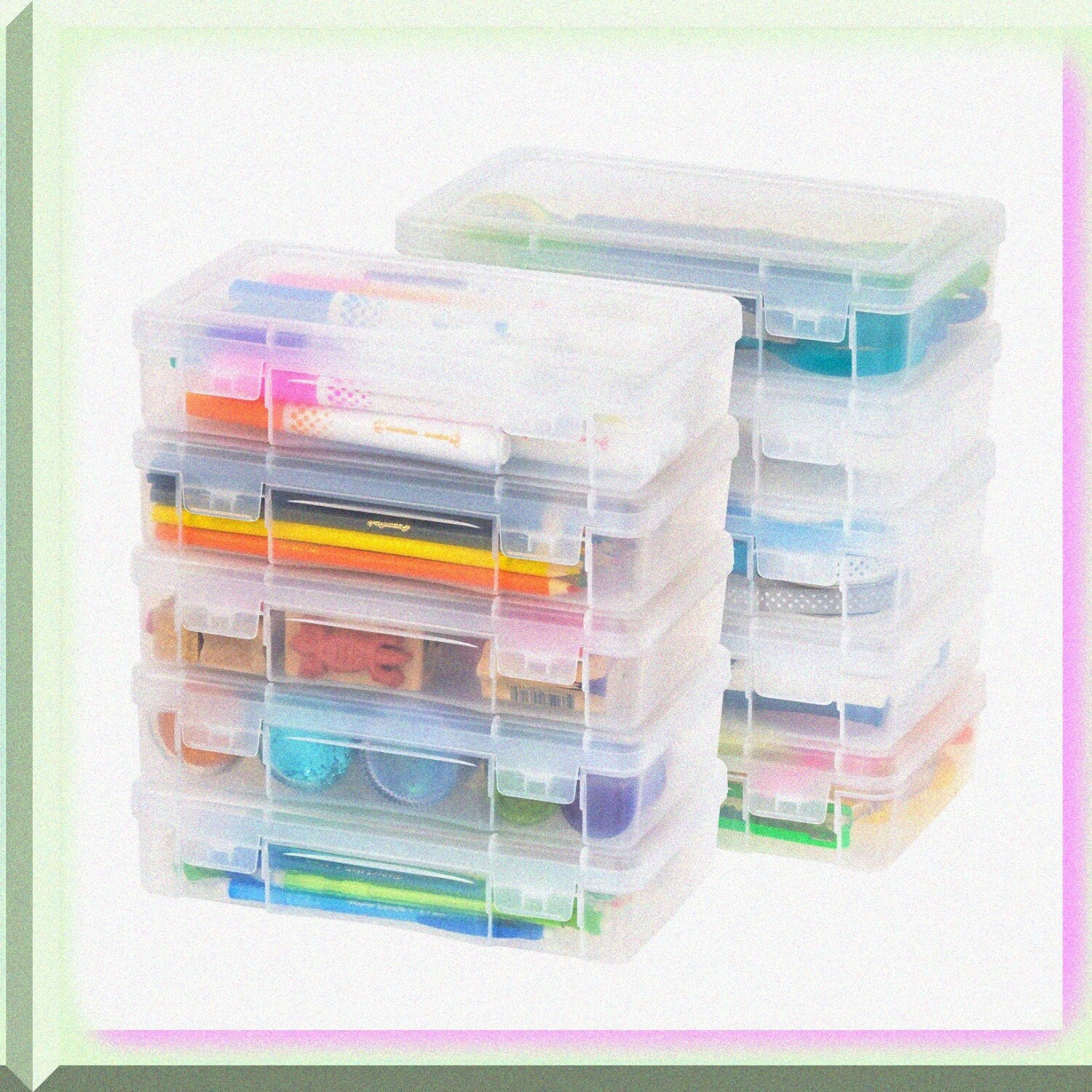 This set includes 10 clear plastic storage containers with snap-tight lids, designed for organizing small items such as pens, pencils, ribbons, washi tape, beads, stickers, yarn, ornaments, and other craft supplies. Each container features a secure latch to keep contents safe from dust and liquids, making them suitable for use in school, home, garage, workshop, hobby, or office environments. The see-through design allows for quick identification of stored items from any angle, enhancing efficiency. Labeling the sides or tops of the containers helps categorize and streamline organization. These modular boxes are stackable, saving space and keeping your workspace tidy. Available in small, medium, and large sizes, they provide versatile storage options for stationery, documents, small tools, card stock, embossing folders, and miscellaneous supplies. Perfect for maintaining an organized, accessible, and clutter-free environment.