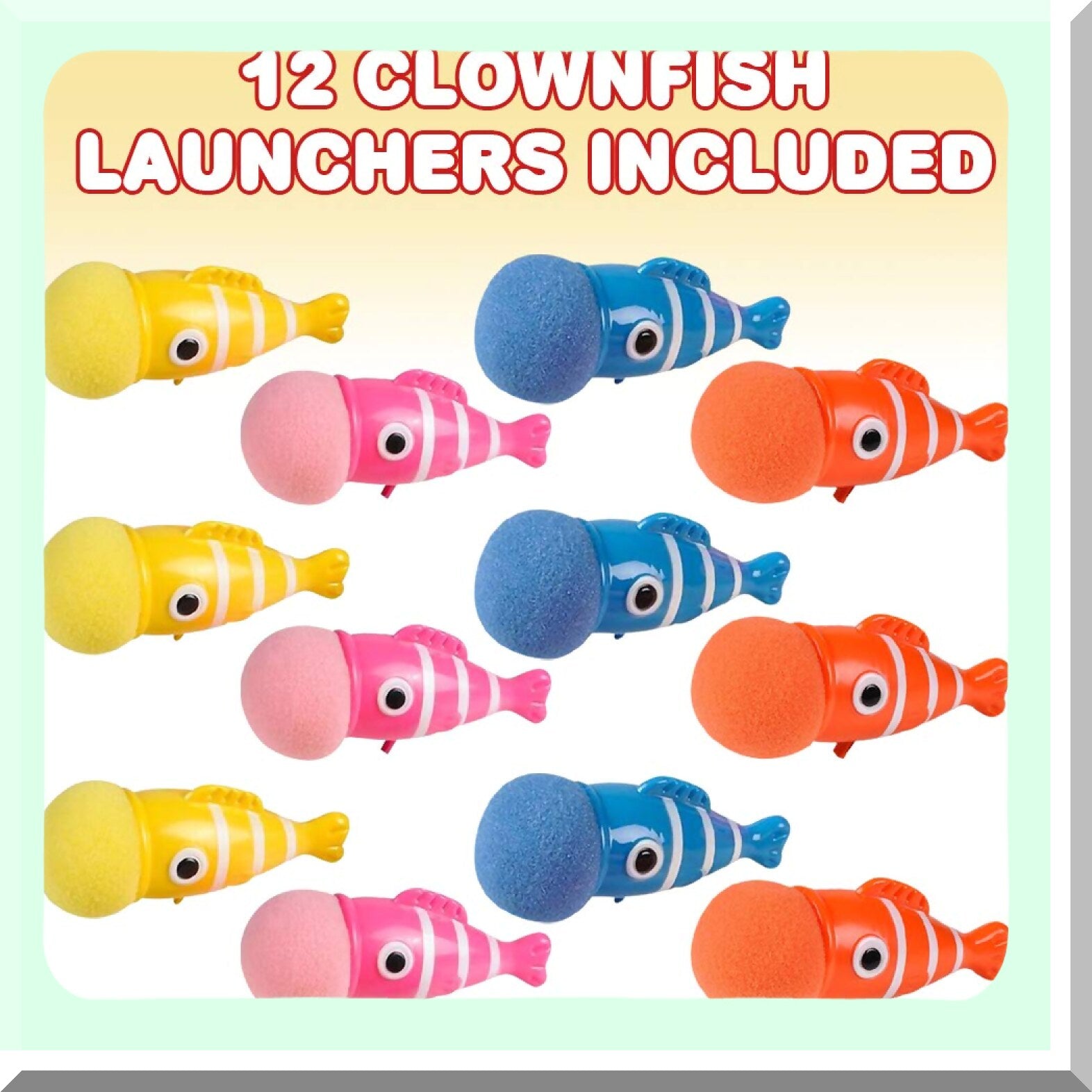 Set of 12 foam ball launchers featuring colorful clownfish designs, perfect for kids' parties and playtime. Each 6-inch toy is made from durable, soft foam, ensuring safe and long-lasting fun. Simply press the latch to launch the foam ball into the air, providing hours of entertainment and giggles. The foam ball is attached to the clownfish with a string, preventing loss during play. Bright, vibrant colors add a cheerful touch to any setting, making these toys ideal as party favors, goodie bag fillers, or prizes. Suitable for children aged 3 and up, these classic toys encourage active play and social interaction. They are easy to use, safe, and designed for repeated fun. Great for birthday celebrations, school events, or everyday entertainment, these foam launchers bring retro-inspired excitement to kids’ playtime. A fun, affordable way to add joy and laughter to any occasion.