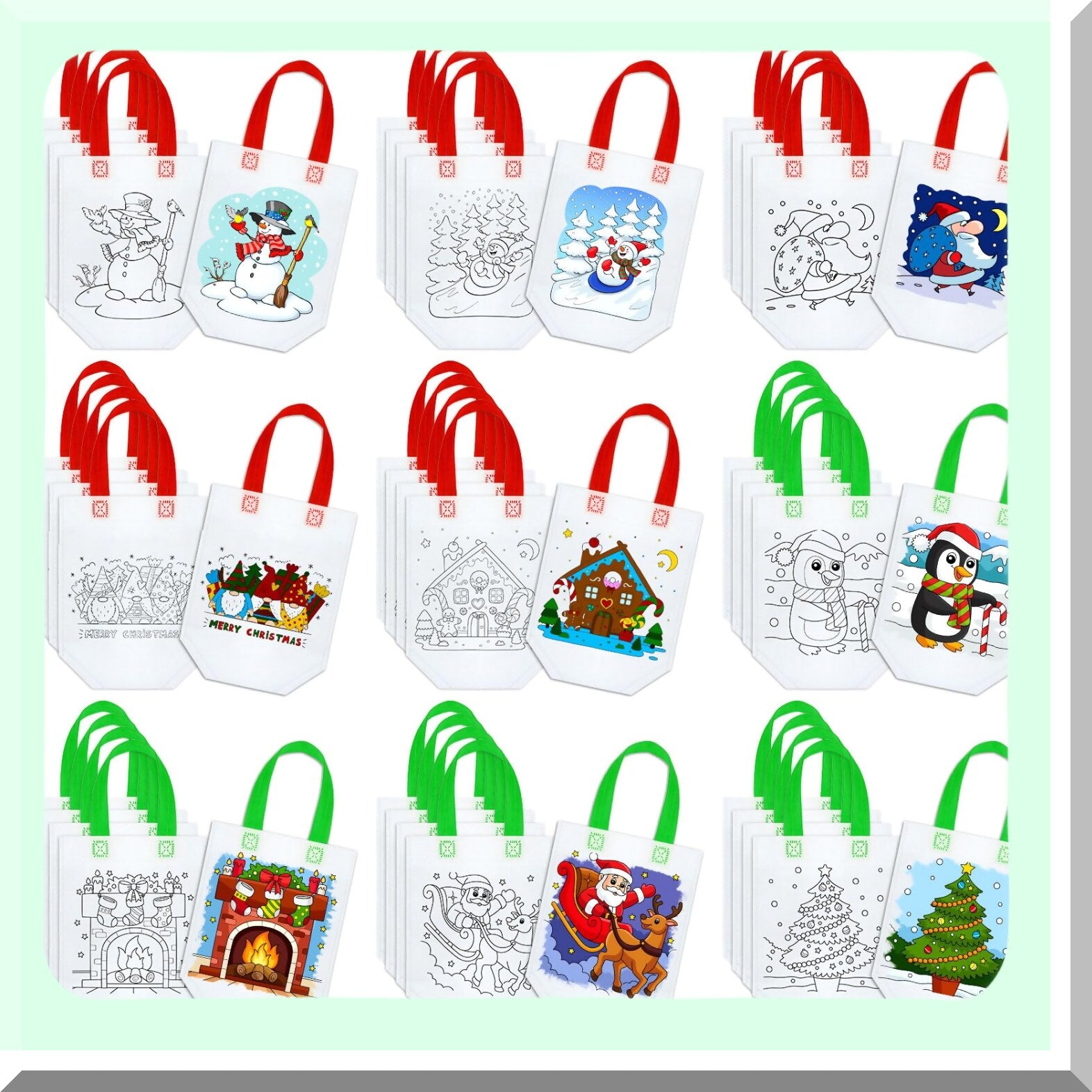 This set includes 45 reusable coloring goodie bags in 9 diverse styles, each approximately 10 x 8 inches with a 5-inch handle. Made from durable non-woven fabric, these bags are reliable, safe, and slightly waterproof, suitable for storing small crafts and party favors. The bags feature simple, cute printed designs such as snowmen, penguins, and other festive characters, with bold lines for easy coloring using crayons or colored pencils (not included). Designed to engage children, these bags help develop their creativity, color matching skills, and patience while providing a fun activity during parties, school events, or daily leisure. The practical size and handle make them easy for kids to carry and use. Perfect for birthday parties, classroom activities, travel, or as thoughtful gifts, these coloring bags are a meaningful way to keep children entertained and away from screens, fostering quality parent-child bonding time.