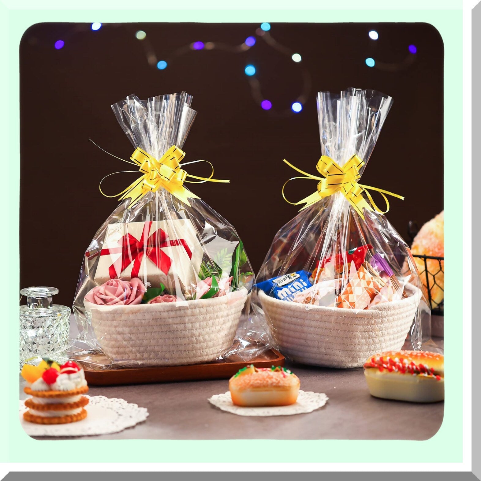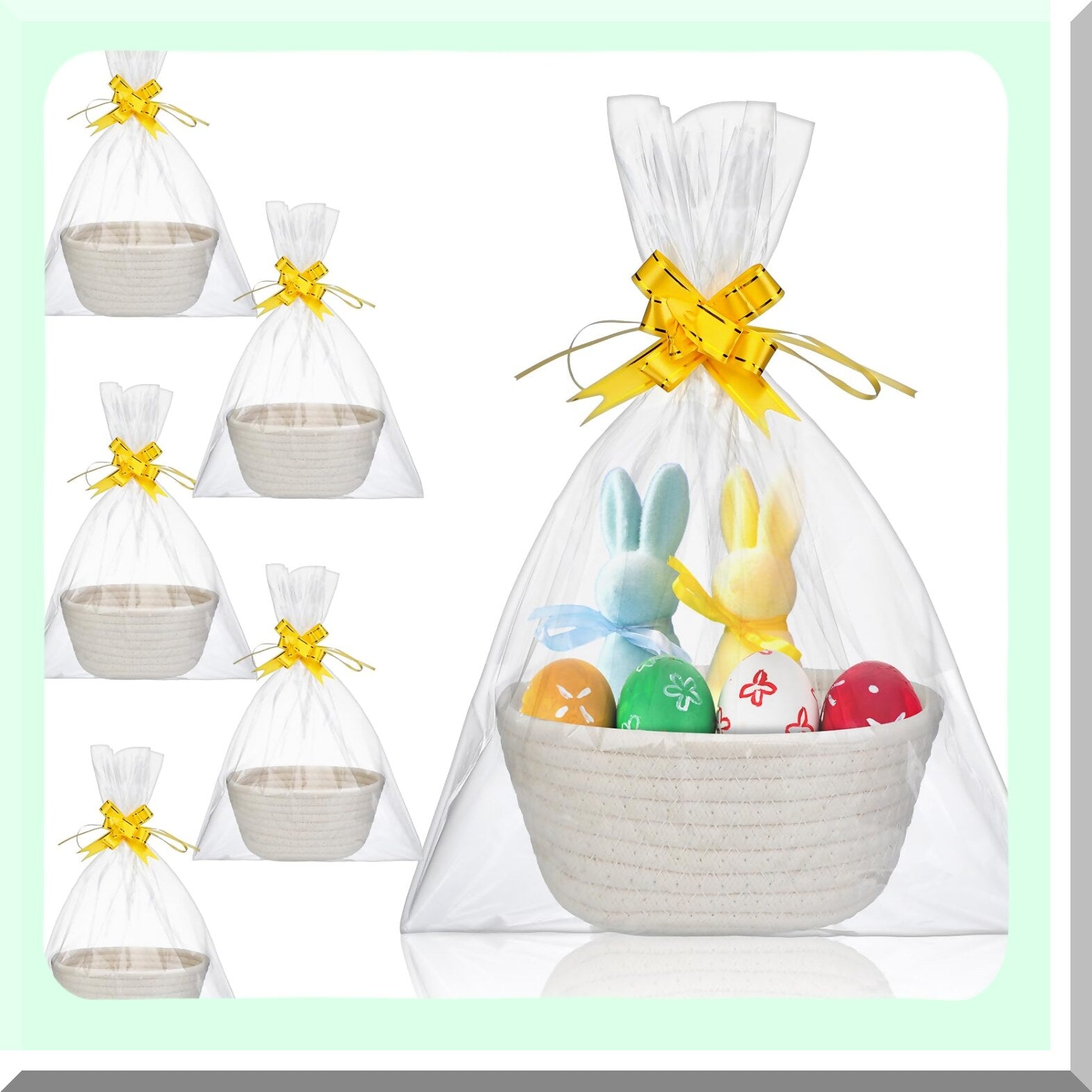 These small white cotton rope baskets are practical storage solutions suitable for organizing toys, towels, snacks, fruits, spa supplies, socks, magazines, and diapers. Designed with a modern white color and a chic clic style, they add a touch of elegance to any space. Each basket measures approximately 9.8 x 7.9 x 3.5 inches (25 x 20 x 9 cm), offering ample capacity while maintaining a cute size. Made from durable cotton rope, these woven baskets are sturdy, flexible, and space-saving when not in use. The set includes six baskets, six gift bags, and six ribbons, making them ideal for gift preparation and presentation. Perfect for various occasions such as baby showers, bridal events, Mother's Day, Thanksgiving, and birthdays, these baskets are versatile and charming. Their simple, clean design complements different room decors, making them a delightful addition to any home or gift collection.