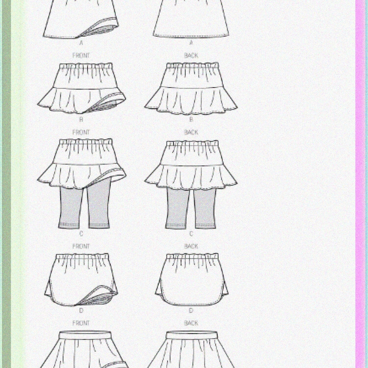 This girls' skort pattern features a narrow hem design with attached leggings and side godets for added style. The skorts have an elasticized waist casing and an elasticized, foldover waistband for a comfortable fit. Designed for lightweight two-way stretch knits, the pattern is suitable for fabrics like jersey and cotton blends. The pattern includes pieces and sewing instructions, making it easy to create a stylish and functional garment. The design incorporates attached shorts for added coverage and mobility. Available in sizes CCE (3-4-5-6), the pattern is ideal for children's girls' sizes. Notions required include 1 yard of 3/4" elastic. The pattern is printed and includes all necessary components to craft a versatile skort with a narrow hem, attached leggings, and side godets, perfect for casual or active wear.