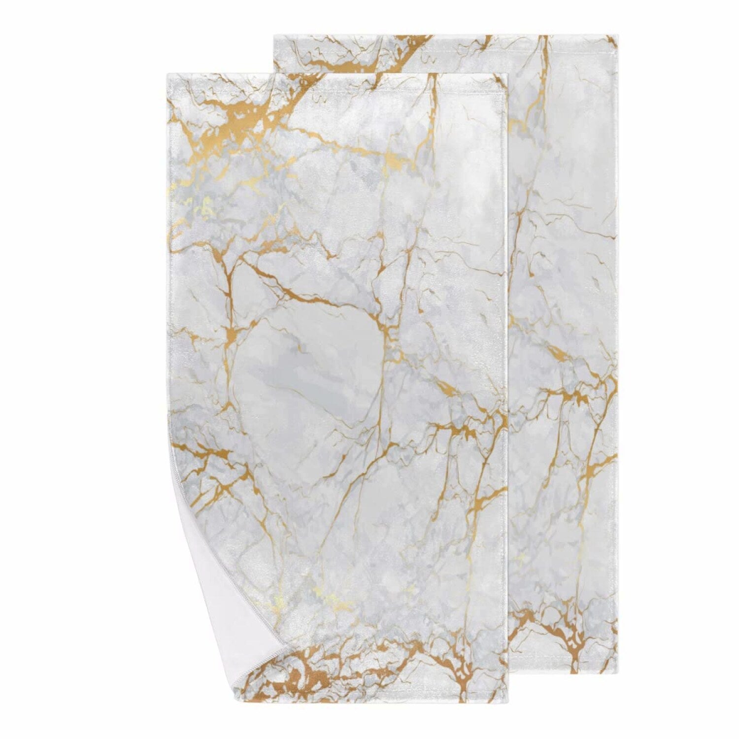 This set includes two marble gold textured hand towels measuring 28x14 inches, crafted from a blend of polyester microfiber and premium cotton for quick drying and durability. Designed for versatile use, these soft, lightweight towels are ideal for bathroom, kitchen, gym, spa, or travel. Their highly absorbent surface ensures efficient drying, while the bright marble pattern adds a touch of elegance to any setting. The towels are easy to care forโsimply hang to dry after use and avoid hot washing above 40 degrees. They resist fading, remain soft over time, and are portable for on-the-go needs. With a total weight of 249 grams, each towel combines functionality with aesthetic appeal, making them suitable for personal use or as a thoughtful gift. Their breathable, sweat-absorbent material provides a refreshing feel, perfect for everyday use or special occasions.
