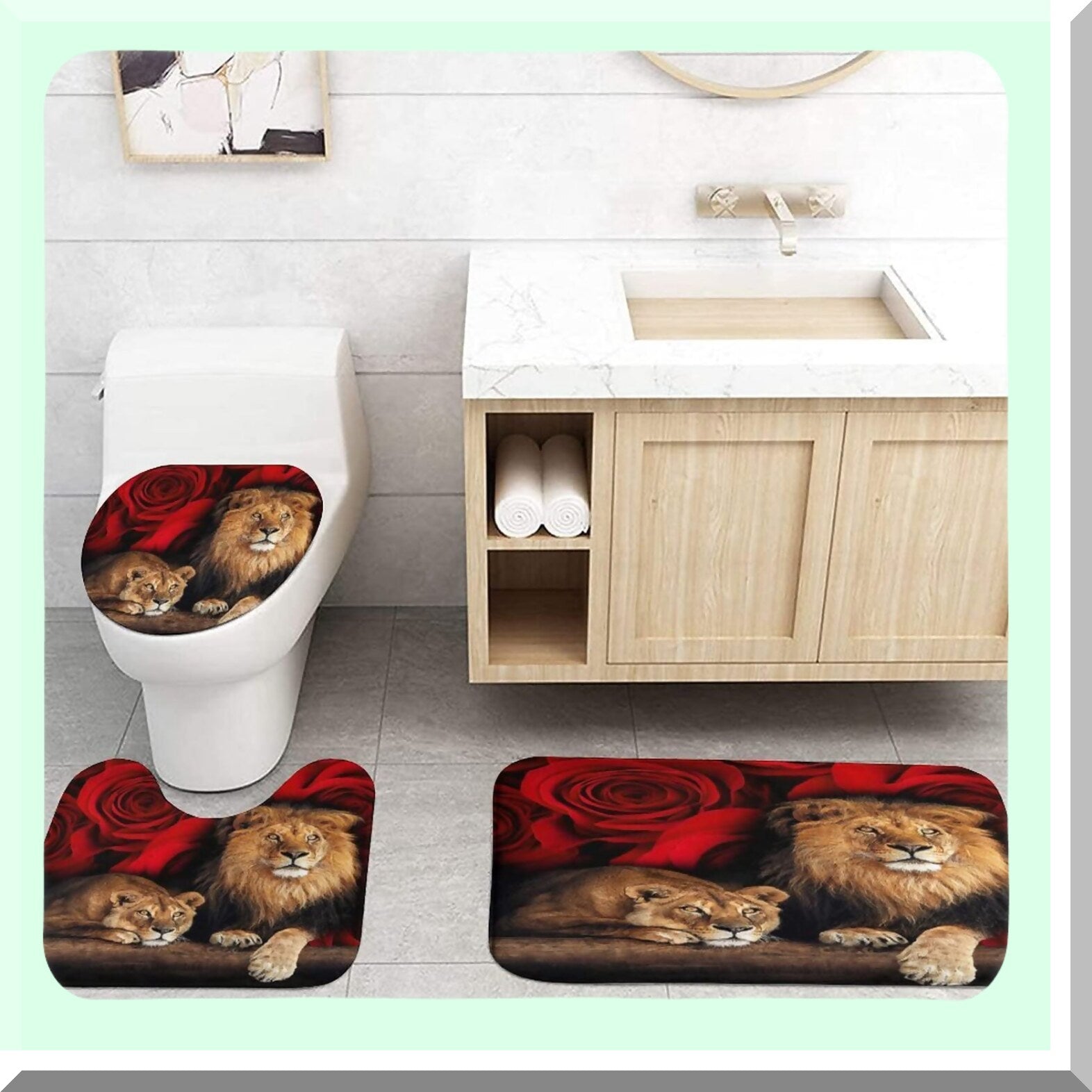This bathroom set includes four pieces: a red shower curtain with 12 hooks, a bath mat, a tet lid cover, and a U-shaped carpet. The shower curtain measures approximately 70.9 inches by 70.9 inches, while the bath mat is about 17.7 inches by 29.5 inches. The tet lid cover is approximately 13.8 inches by 17.7 inches, and the U-shaped carpet is around 14.8 inches by 17.7 inches. Crafted from 100% soft polyester, the set is waterproof, durable, and eco-friendly, featuring HD digital printing for clear, bright patterns with environmentally friendly ink. The bath rug is made of thickened high-quality flannel, offering good texture and anti-slip properties. Easy to install with included hooks, the set is machine washable for convenience. It is suitable for enhancing bathroom decor with a romantic and strong aesthetic, providing a pleasant experience for family and pets alike.