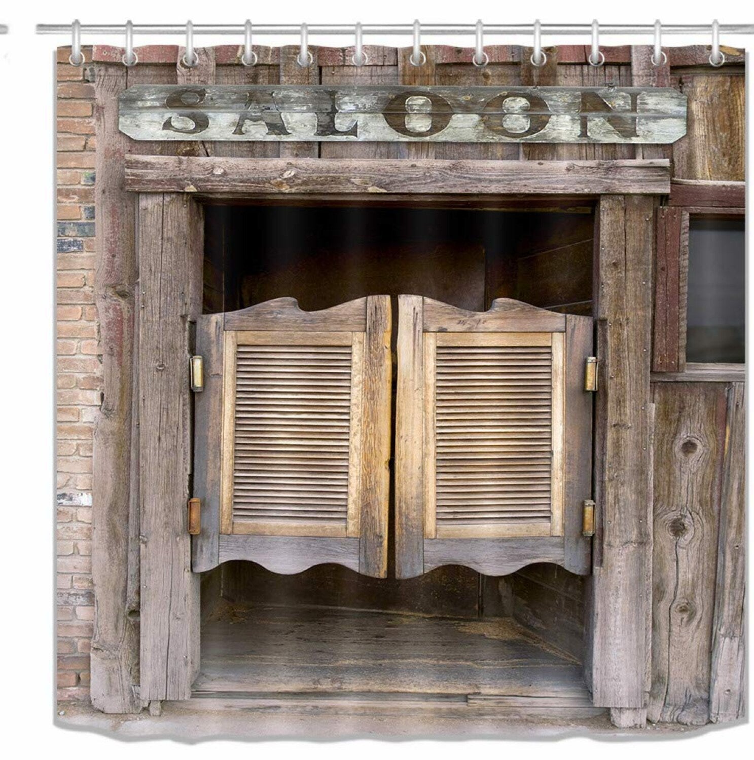 This vintage-inspired shower curtain features a rustic Western design with a classic cowboy saloon and bar motif, perfect for adding a touch of country charm to your bathroom. Made from durable polyester fabric, it offers vivid colors that resist fading over time. The curtain measures 60 inches wide by 72 inches high, fitting most standard shower rods, and includes 10 plastic rings for easy installation. Its waterproof material ensures reliable protection against water splashes, while the fabric is machine washable and easy to maintain. Suitable for various occasions, it can also serve as a door curtain, window covering, party backdrop, or garden decor, making it versatile for home or hotel use. The design can be customized in size and pattern to suit your preferences. Please note that measurements are taken by hand, so slight deviations may occur, and colors may vary slightly due to display differences.