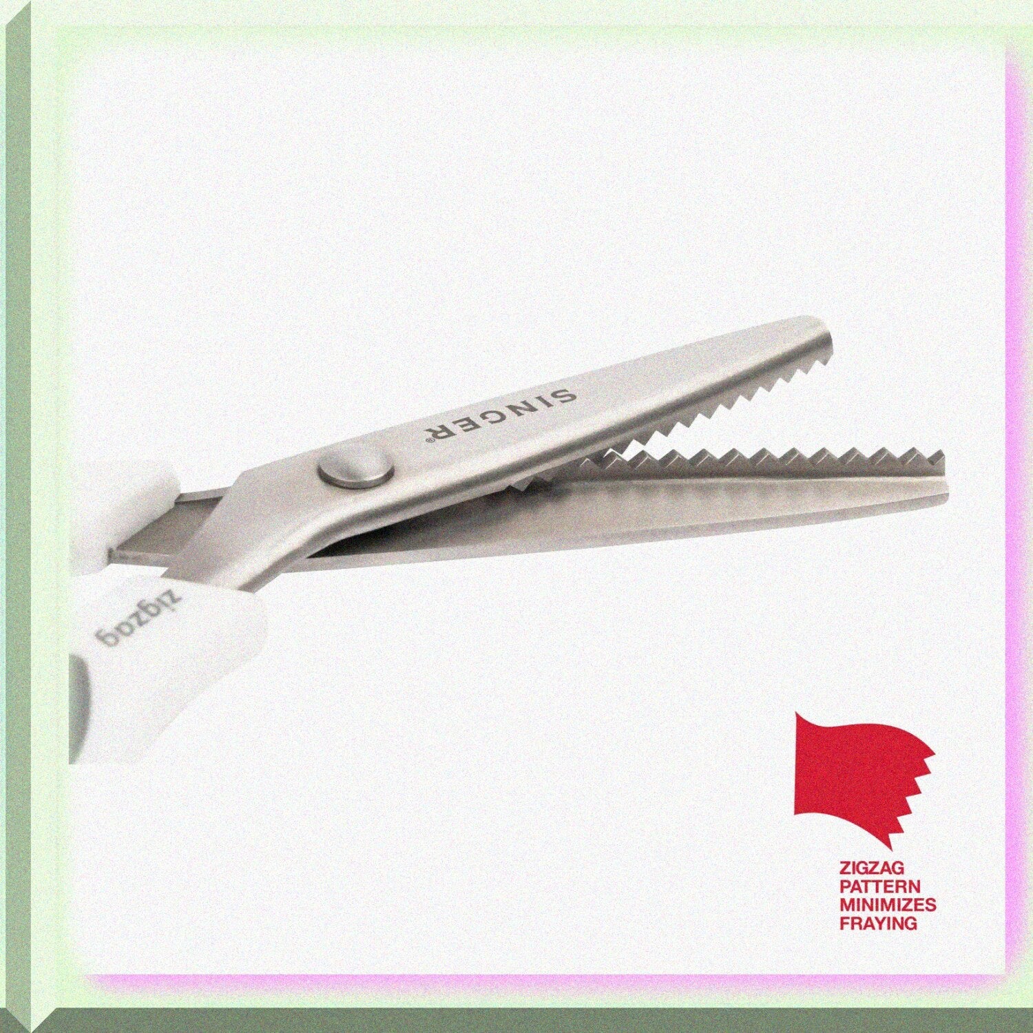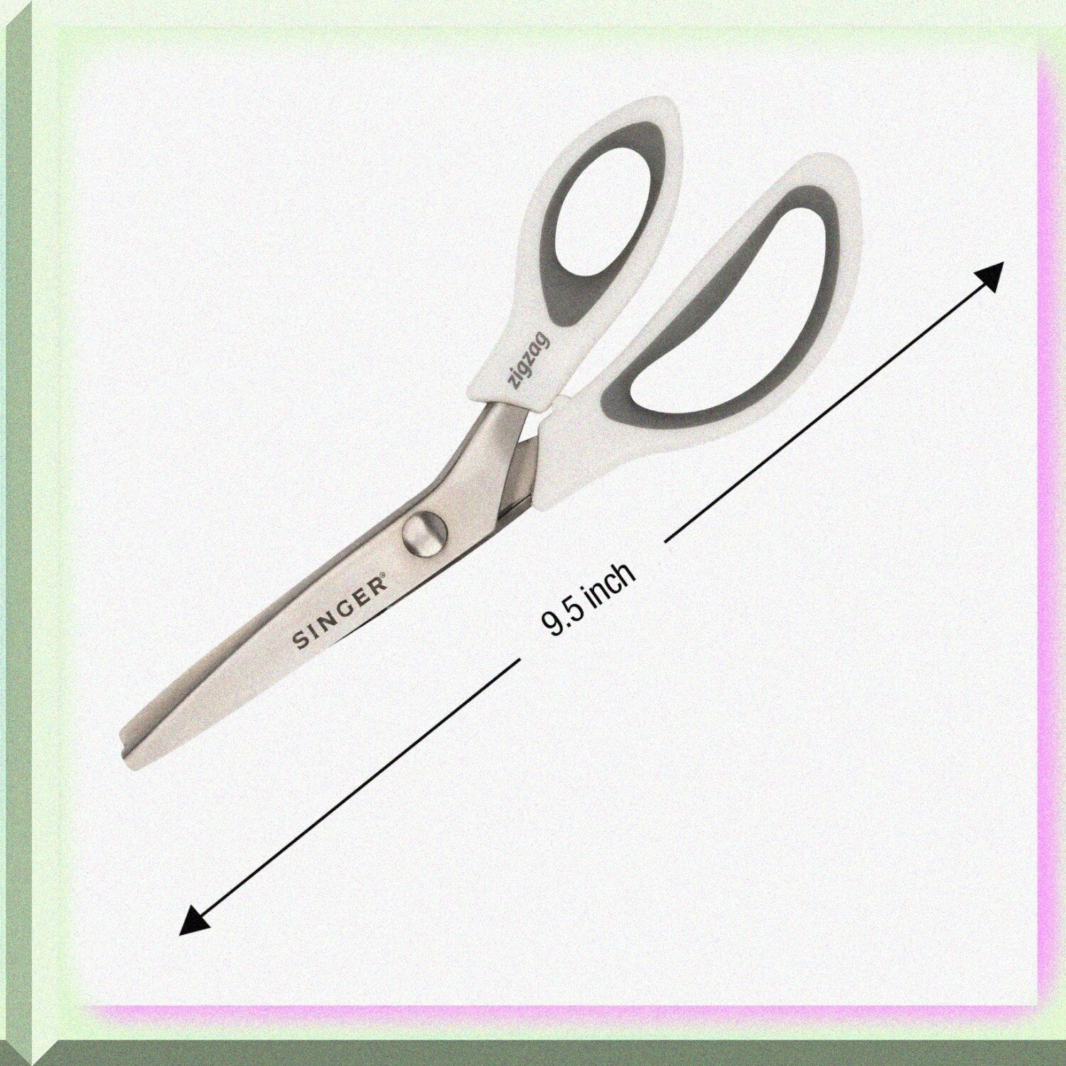ZigZag Fabric Snippers are 9-inch pinking shears featuring sawtooth blades designed to cut zigzag patterns. These shears are ideal for finishing fabric seams, as the zigzag cuts help reduce fraying on woven fabrics such as cotton, chiffon, denim, flannel, taffeta, and chintz. The durable stainless steel blades ensure long-lasting sharpness and durability, making them suitable for various sewing and craft projects. The soft grip handle provides comfort during use, allowing for precise and pain-free cutting. The blades are crafted for accuracy, creating crisp decorative edges and helping to minimize fabric fraying. Regular maintenance, including cleaning and joint lubrication, will ensure optimal performance. These shears are not intended for cutting materials outside their design scope. Their clean, modern look features a white handle with grey accents, combining functionality with style.