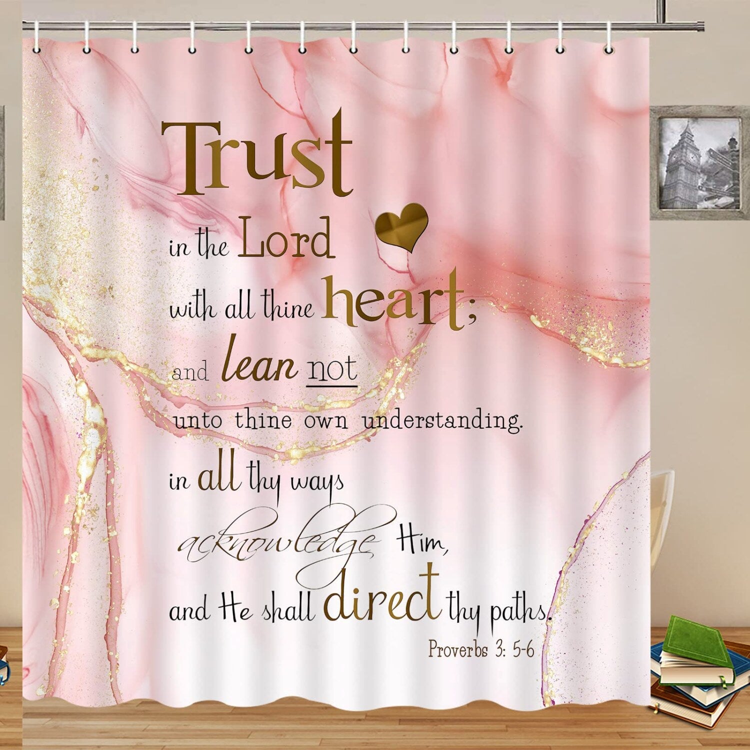 This shower curtain measures 70 x 70 inches and is designed to fit most standard-sized bathrooms. Made from soft, polyester material, it offers a comfortable feel and is easy to clean through machine washing. The curtain features an elegant pink marble abstract pattern with modern luxury gold accents, including an inspirational quote: "Trust in The Lord with All Thine Heart." Its fade-resistant fabric retains vibrant colors wash after wash, ensuring long-lasting beauty. The curtain helps prevent water from splashing outside the shower stall, maintaining a dry bathroom environment. It comes equipped with C-shaped hooks for effortless installation on a steel tube. The curtain is environmentally friendly and suitable for everyday use. Please note that due to monitor differences, colors may vary slightly, and manual measurement may result in a 1-2 cm error. Proper care involves cold machine washing without bleach or tumble drying. Shipping and import duties are the buyer’s responsibility.