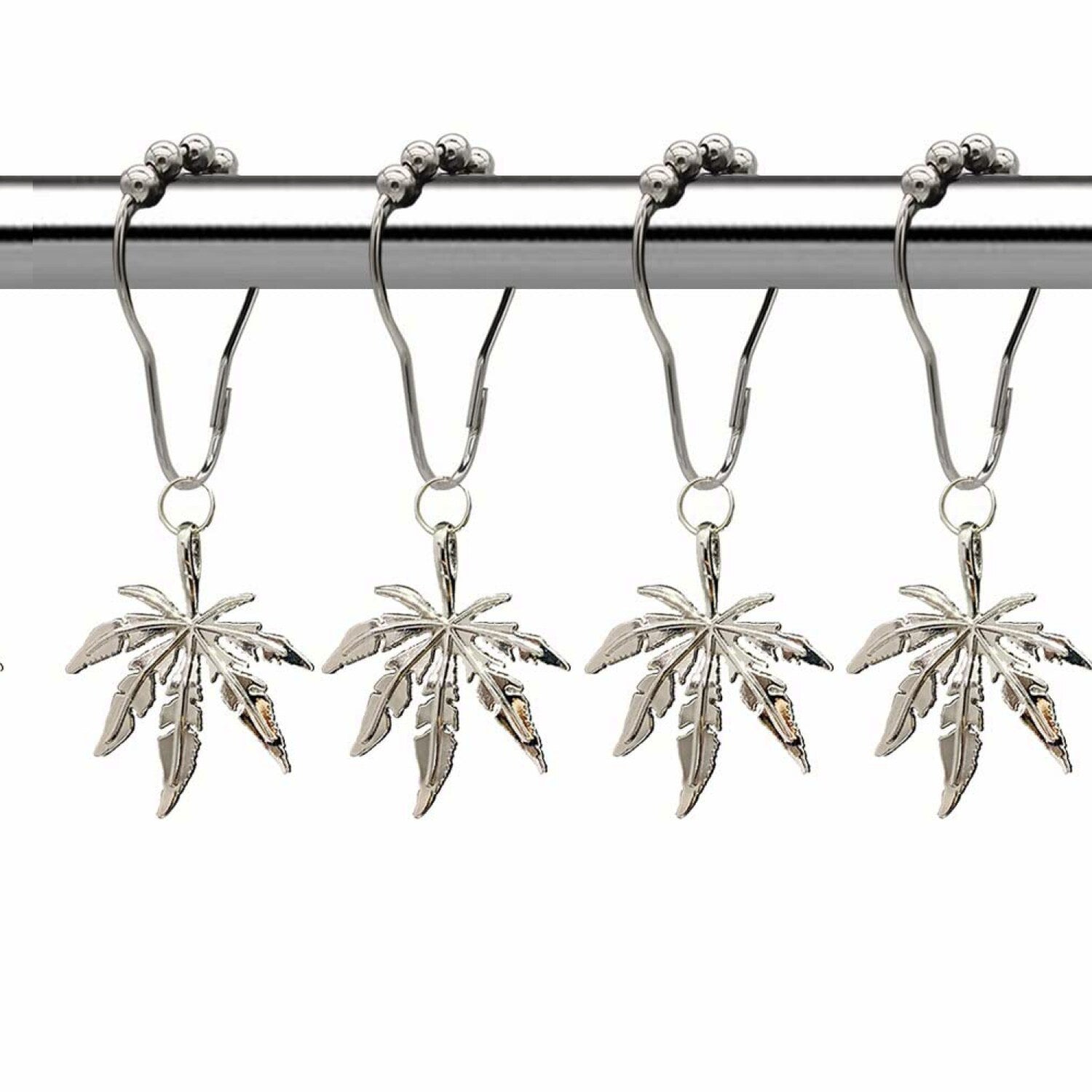 These shower curtain hooks are crafted from durable stainless steel, ensuring rust resistance and stability for heavy curtains. The hooks feature a polished chrome finish that prevents rust, even in wet bathroom environments. Designed for smooth sliding along shower rods, they eliminate noise and prevent scratching, making opening and closing effortless. Each set includes 12 hooks, each adorned with a decorative marijuana leaf pendant, adding an elegant touch to your bathroom decor. Suitable for standard shower curtain rods measuring 22-35mm in diameter, these hooks are versatile and can be used in various rooms such as living rooms, bedrooms, children's rooms, or outdoor spaces like courtyards. They can also serve as decorative pendants in homes, cafes, restaurants, or dormitories. The set combines functionality with aesthetic appeal, providing a practical and stylish solution for hanging curtains or decorative items.