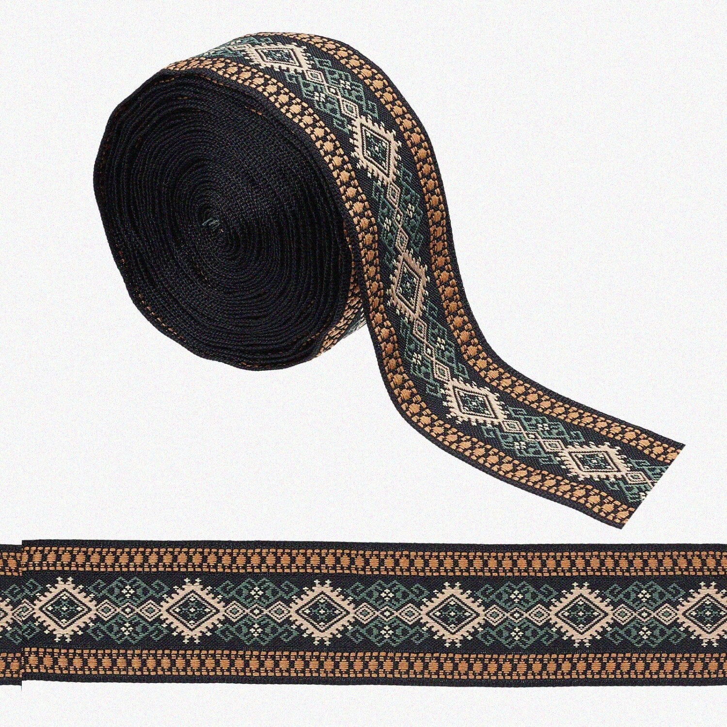 This vintage jacquard ribbon features an ethnic style rhombus pattern, crafted from polyester with a vibrant ocher color. Measuring approximately 1.50 inches (38mm) wide and 0.03 inches (0.8mm) thick, each roll contains 5 yards of this decorative fabric trim. The wired edge design allows for easy shaping and handling. Its versatile design makes it suitable for a variety of DIY projects, including creating mini top hats, hairbands, pillowcase edging, bows, wreaths, dresses, bag straps, towels, curtains, and gift wrapping. The high-quality polyester material ensures a smooth finish and bright coloration, ideal for home decor, wedding celebrations, festivals, birthday parties, garment embellishments, and more. This ribbon is perfect for adding a vintage touch to your craft and decoration projects, offering both aesthetic appeal and practical usability.