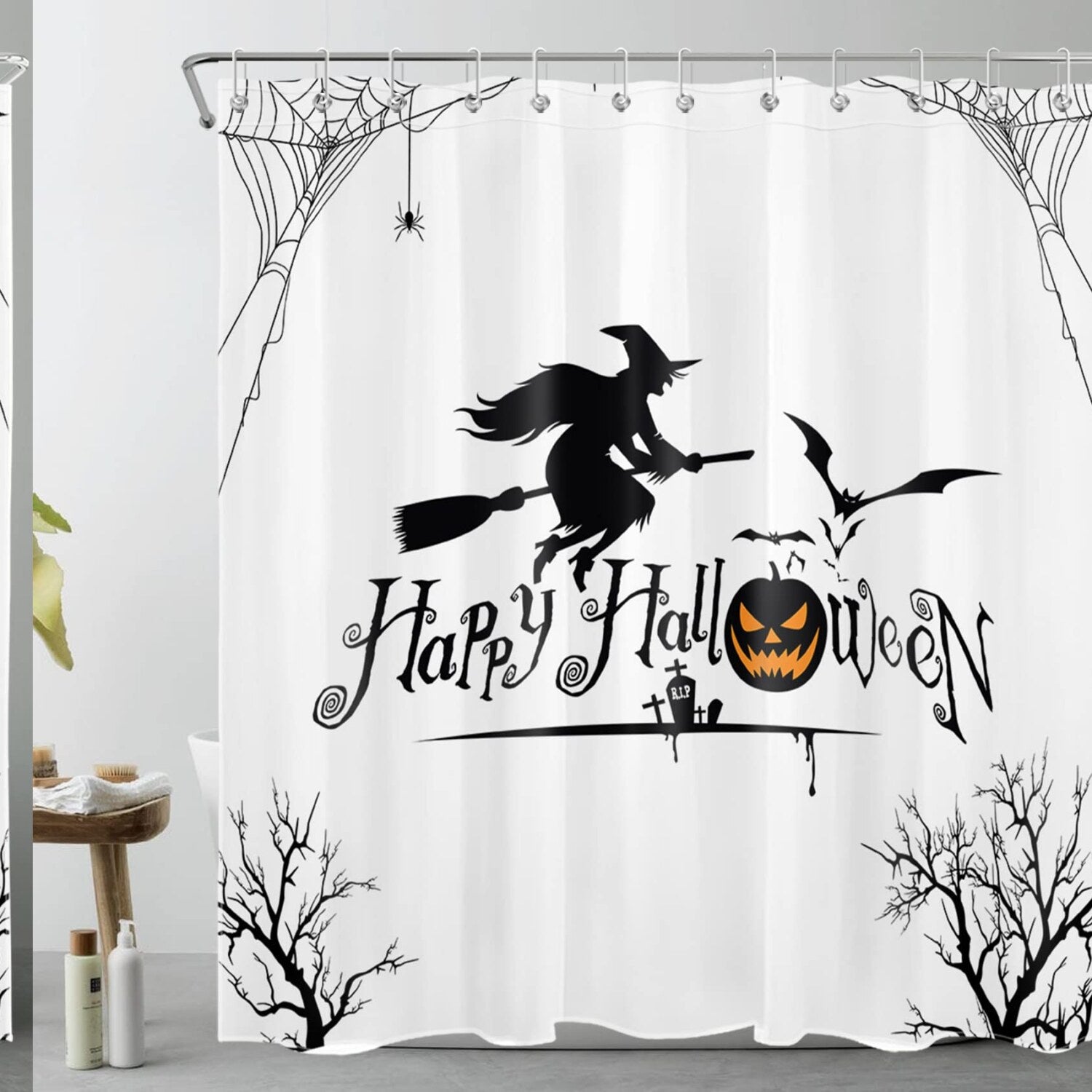 This shower curtain features a black and white design with a spider web, pumpkin, and bat motif, adding a spooky touch to your bathroom decor. Made from high-quality polyester fabric, it offers a soft, smooth, and flowing texture that is comfortable to the touch. The fabric is durable, water-resistant, and dries quickly, providing effective privacy while allowing water to stay within the shower area. The curtain measures 72 inches wide by 72 inches high, suitable for standard bathroom spaces, and includes 12 plastic hooks for easy installation. It is digitally printed in high definition, ensuring vibrant colors that resist fading over time. Easy to care for, it can be hand or machine washed in cold water, and should be hung to dry in shaded areas, avoiding prolonged exposure to direct sunlight. Iron at low temperatures if needed. This curtain is a perfect addition to create a fun and spooky bathroom atmosphere.