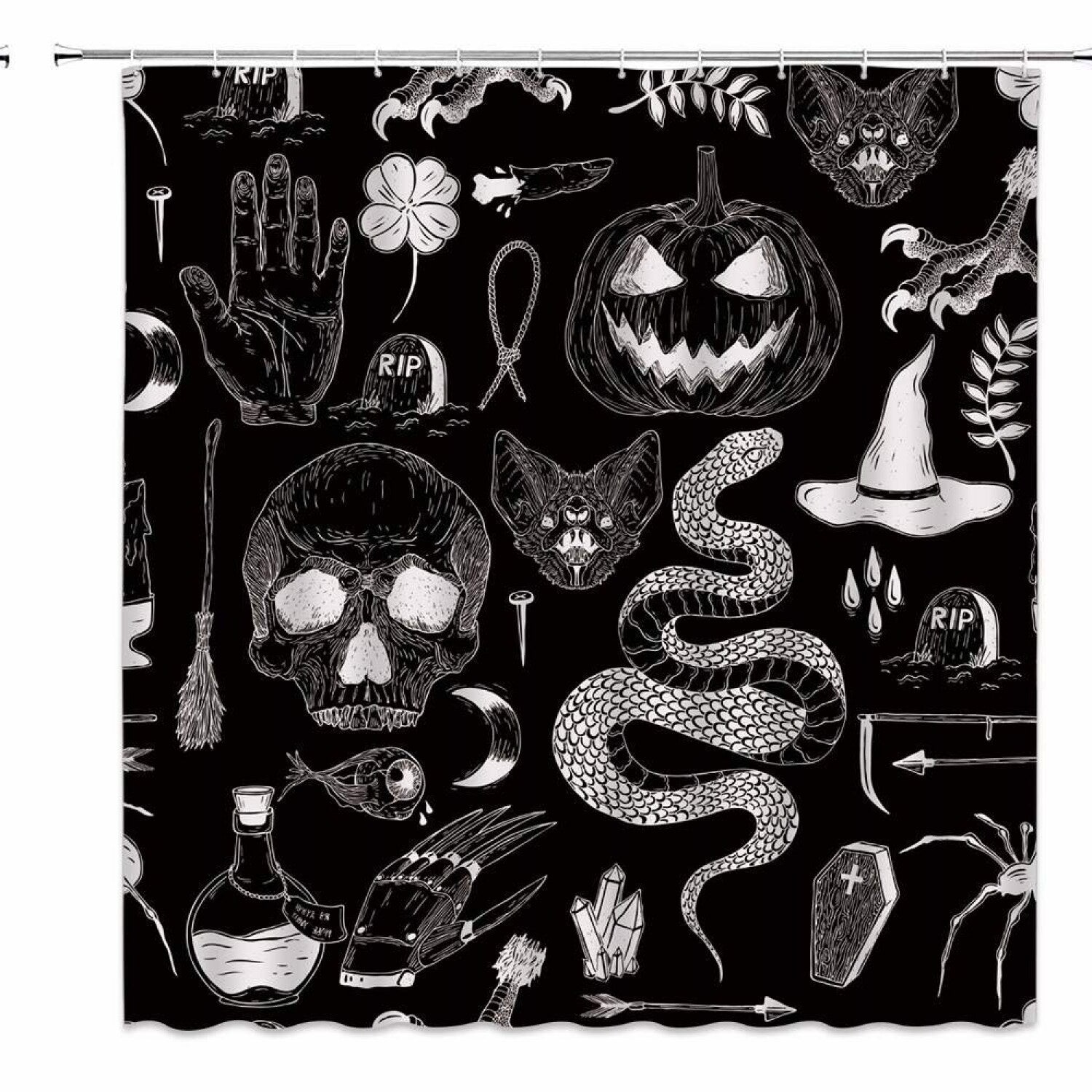 This shower curtain features a creative and unique design with spooky elements such as pumpkins, skulls, ghosts, and watercolor accents, perfect for adding a fun, artsy touch to any bathroom. Made from quick-drying polyester fabric, it offers durability and ease of use. The set includes one shower curtain and twelve plastic hooks for simple installation. Available in multiple sizes, including 70x70 inches and larger options, it fits various bathroom spaces comfortably. The soft fabric provides a bold, cute, and distinctive look that enhances your decor while making shower time more enjoyable. Whether for girls or boys, this artistic curtain transforms your bathroom into a stylish, personalized space filled with playful and spooky charm.