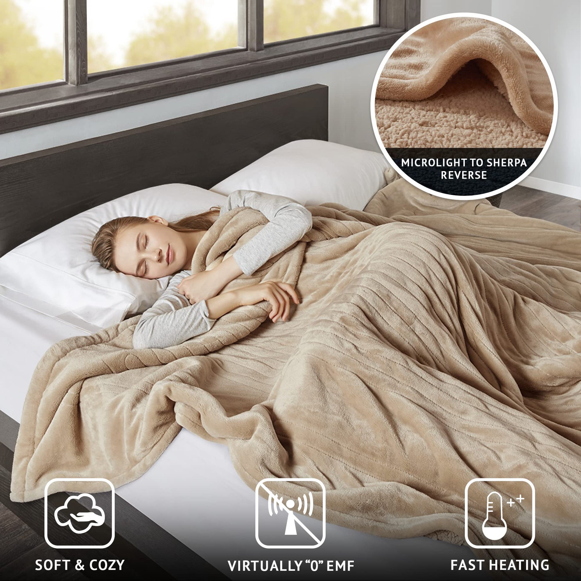 Sleep in ease in our Heated blanket with Secure Comfort Technology, which is designed to virtually eliminate ElectroMagnetic Field emissons. The soft flexible wires and ultra-soft microlight plush fabric ensures your comfort. It reverses to a soft berber that adds extra warmth and loft. The heated blanket features 10 hour auto shut off and has 20 different temperature settings so you can customize the precise temperature you want. It's also machine washable for easy care and OEKO-TEX meaning it does not contain any harmful substances or to ensure quality comfort and wellness. Twin and Full size have one controller, Queen and King size have 2 controllers. Includes manufacturers 5-year warranty.