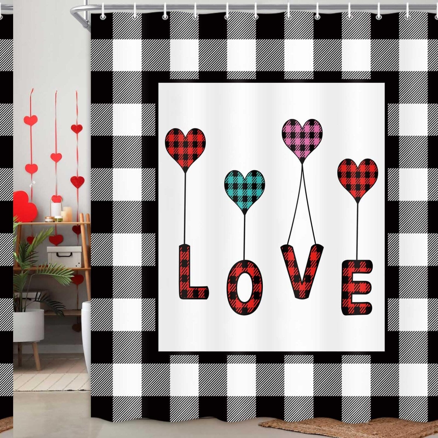 This fabric shower curtain measures 71 x 71 inches, suitable for bathtubs, shower stalls, or any bathroom. Made of polyester fabric, it offers a soft and comfortable feel while effectively preventing water from splashing out. The design features a romantic heart love words and buffalo check plaid pattern, adding a charming touch to your bathroom decor. The set includes 12 C-shaped hooks, making installation easy and secure. Its black and white color scheme brightens the space and creates a cozy, inviting atmosphere. Crafted to be environmentally friendly, this shower curtain combines practicality with aesthetic appeal, enhancing the overall look of your bathroom. Perfect for adding a touch of farmhouse style, it offers both functionality and elegance for everyday use.