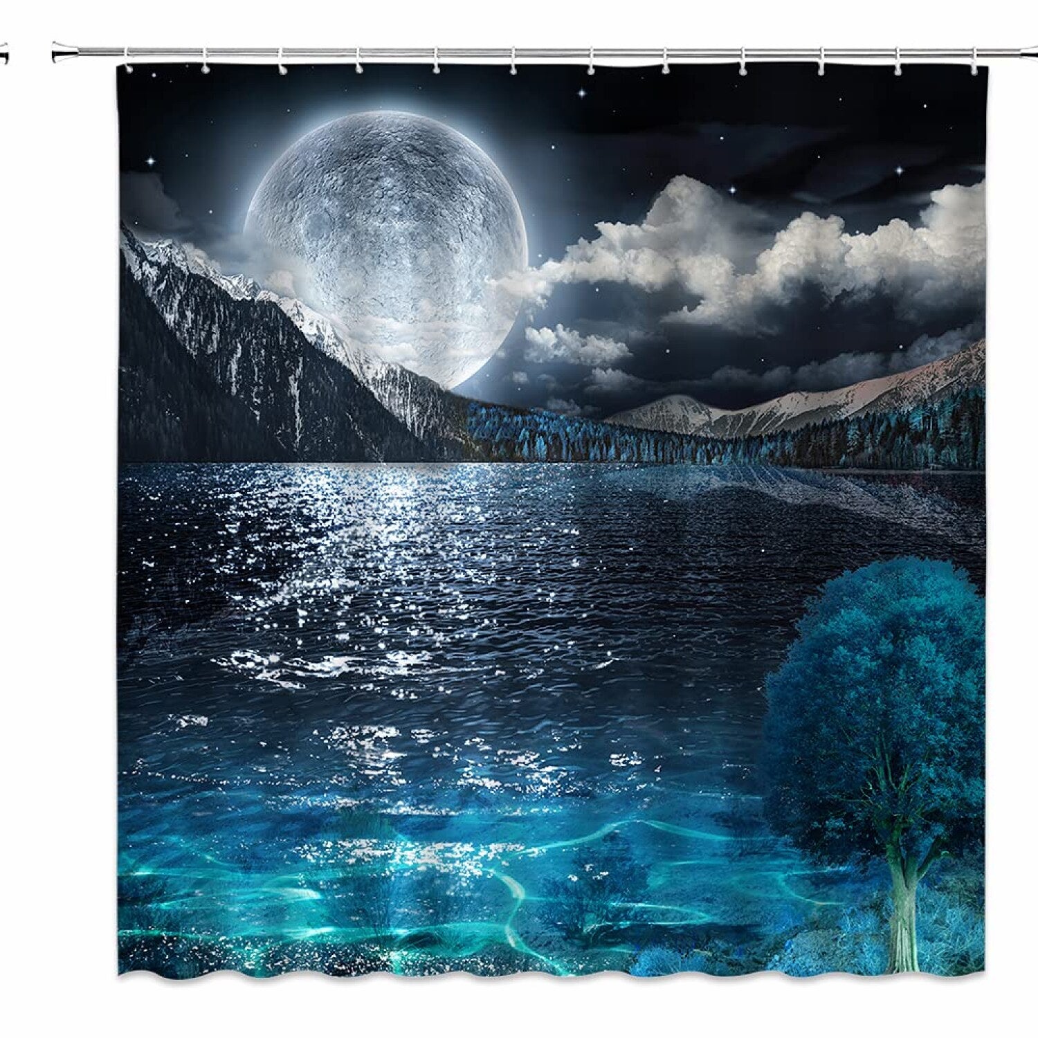 This high-quality shower curtain features a tranquil seascape design with full moon, clouds, mountains, teal trees, and blue sea elements. Made from durable polyester fabric, it offers a stylish and modern look that complements various bathroom decors. The vibrant, high-resolution digital printing ensures colors remain vivid and do not fade over time, adding depth and value to your space. The curtain measures 70x70 inches and includes 12 plastic hooks for easy installation. Its versatile design makes it suitable for bathrooms, apartments, condos, hotels, campers, dorms, schools, gyms, and more. The unique pattern can refresh the appearance of any bathroom or guest suite without significant expense. Perfect as a gift, it appeals to those who appreciate nature-inspired themes like oceans, mountains, and forests. Transform your bathroom into a relaxing retreat with this beautiful, realistic seascape curtain.