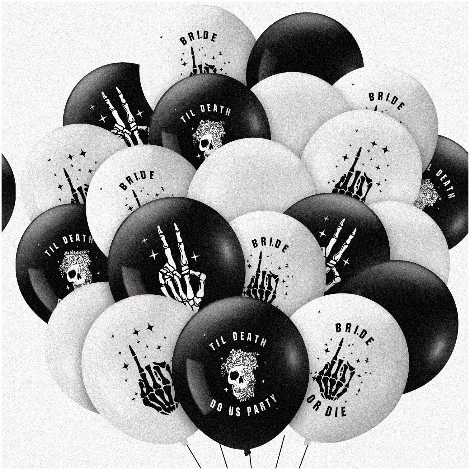 Celebrate your special occasion with a set of 60 latex balloons in black and white, perfect for bachelorette parties, wedding showers, and birthdays. These balloons feature a timeless color scheme that easily complements most decor styles, adding a touch of sophistication and modern flair. Each balloon measures approximately 12 inches in diameter and is made from safe latex material, ensuring reliable quality for a memorable event. The package includes six styles, with ten balloons of each design, including fun phrases like "Bride or Die" and "Til Death Do Us Party," decorated with skull motifs. These versatile balloons can be used to create balloon arches, garlands, or simply as decorative accents to elevate your celebration. Their generous quantity ensures ample decoration options, and their stylish design helps set a lively, elegant mood. Please note manual measurement and slight color variations may occur.