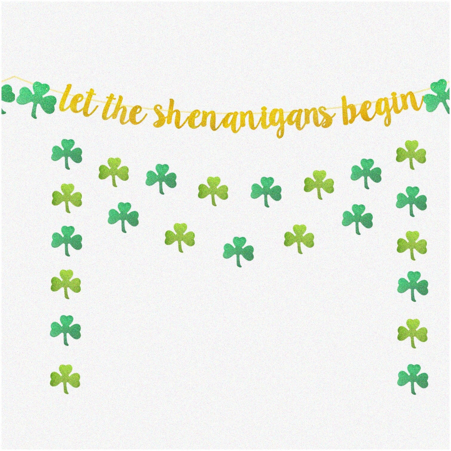 Celebrate St. Patrick's Day with this festive decoration set, featuring a pre-strung "Let the Shenanigans Begin" banner and a felt shamrock garland. The banner, measuring 3-4.5 inches in height, is crafted with vibrant colors and intricate details, adding charm and whimsy to any space. Both decorations are designed for easy hanging, requiring no assembly, making setup quick and hassle-free. The glittery paper banner is durable and reusable, ensuring it can be enjoyed year after year. The felt shamrock garland is simple to assemble and versatile, suitable for indoor or outdoor use. Perfect for homes, offices, or party venues, these decorations can be hung on walls, mantels, or doorways, or used as photo backdrops. Made from high-quality materials, they are sturdy and long-lasting, allowing for multiple celebrations. Bring a touch of magic and fun to your St. Patrick's Day festivities with these eye-catching decorations.