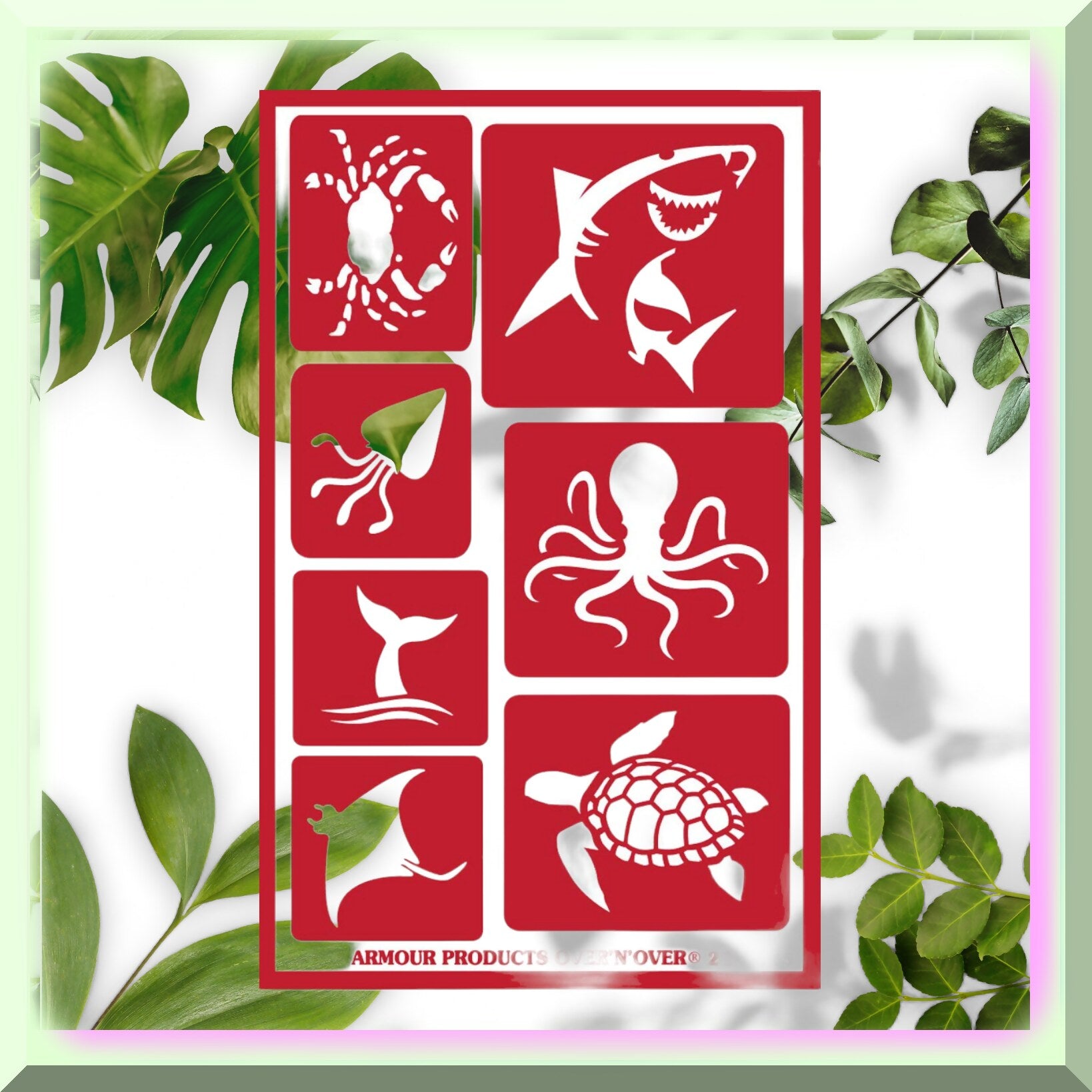 This set includes a reusable 5x8 inch stencil featuring seashore creatures such as crabs, squids, octopuses, sharks, turtles, and more. Made from flexible, durable material, these stencils easily adhere to non-porous surfaces like glass, mirrors, ceramics, and metal, allowing for effortless decoration and personalization. Designed for multiple uses, each stencil can be reused approximately 15-20 times, depending on pressure, care, and the distance between the blasting gun tip and the surface. They are ideal for use with etching creams or painting to create unique designs on various projects. The package provides a versatile tool for adding detailed, marine-themed embellishments to your work. Use these stencils in combination to craft one-of-a-kind glassware or decorative items, enhancing your creative projects with ease and precision. Made in the USA.