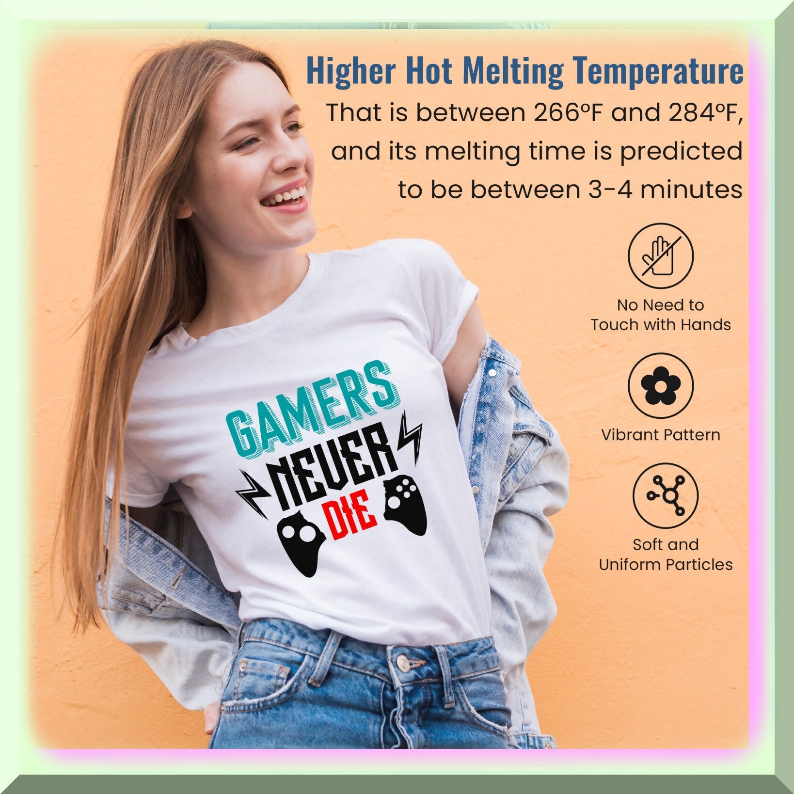 This DTF Powder is designed for film application, providing super adhesive, waterproof, and soft-feeling results with vibrant colors. Packaged in 17.6 oz (500g), it is suitable for a wide range of uses. The powder is easy to use and delivers professional-grade quality for DTF printing, making it ideal for novices, makers, and business owners. For best results, maintain a working temperature of 22-28°C (71.6-82°F) and humidity levels between 55% and 65%. Baking should be performed at 130-140°C (266-284°F) for 3-4 minutes, with a focus on lower temperatures and longer durations. Heat pressing is recommended at 130-150°C (266-302°F) for 10-15 seconds. Peeling the pattern 10-15 seconds after heat pressing enhances transfer quality. Made from high purity polyurethane, this powder ensures strong adhesion and reliable performance, offering a soft feel and vibrant color output.