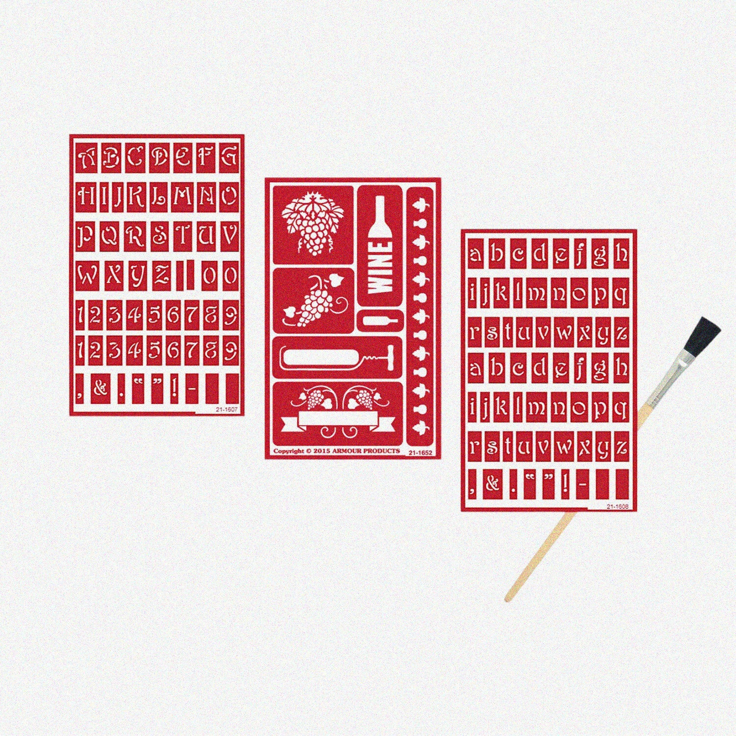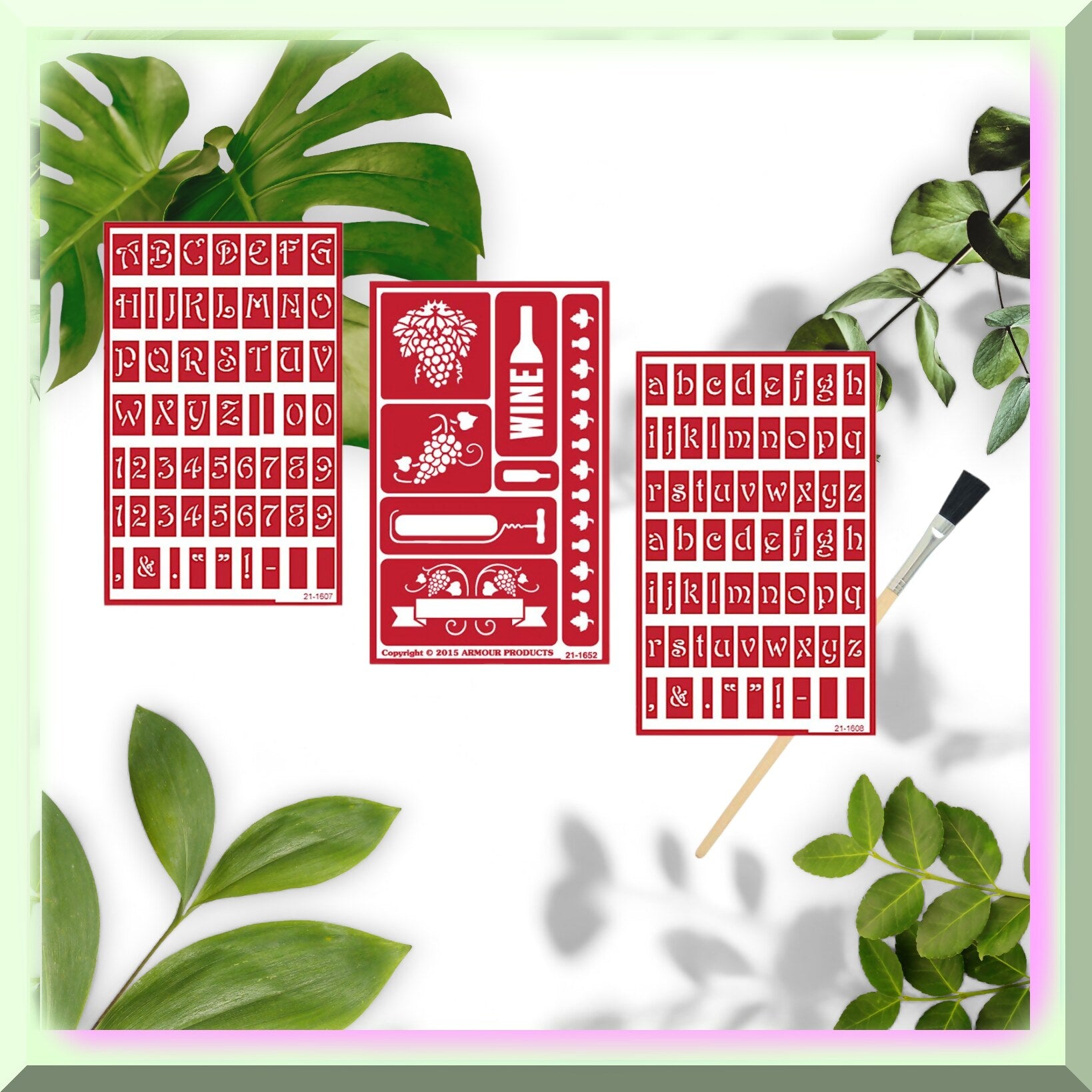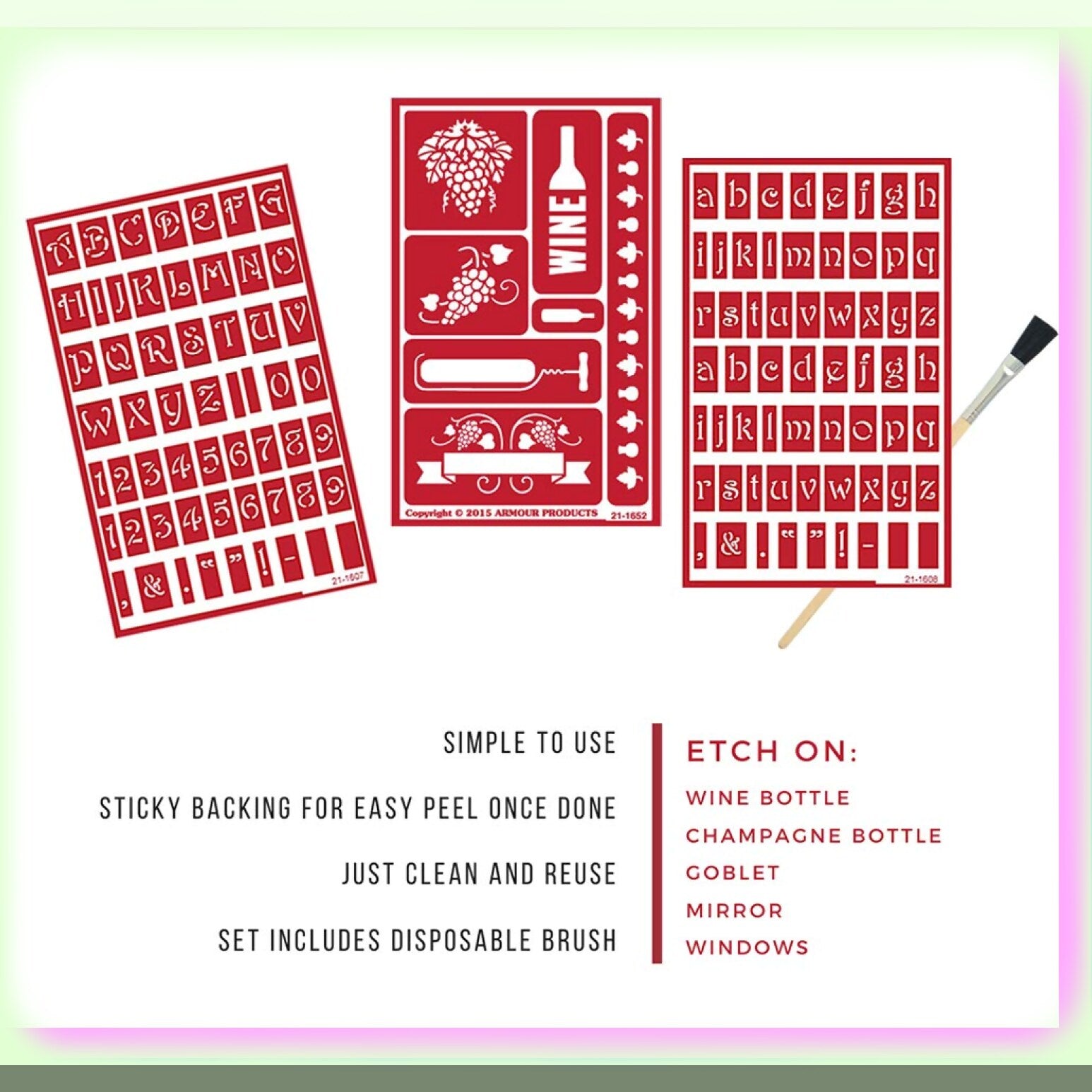 This set includes three reusable glass etching stencils featuring a wine, grape, and font theme, suitable for various special occasions. The designs encompass uppercase and lowercase alphabet letters, with widths ranging from 1/8" to 1/2" and a height of 5/8". Additional designs include large grapes measuring 1.75" x 2", a wine bottle at 0.75" x 2.75", a corkscrew at 3.5" x 0.75", a banner at 3.25" x 1.5", and a grape leaf border of 0.7" x 5". The stencils are made with a flexible, adhesive-like backing that allows easy peeling and repositioning. They can be used to etch on wine bottles, champagne glasses, goblets, mirrors, or windows with etch cream or water-based paint. The set also includes a brush for application, making it ideal for personalized decor or gifts.