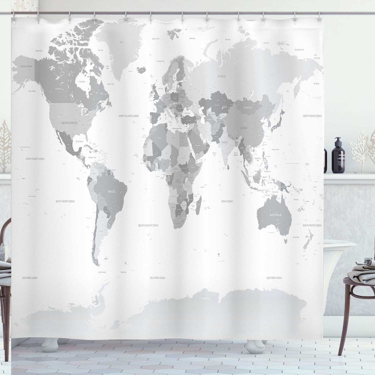 Transform your bathroom with this grey shower curtain featuring a detailed world map showcasing all countries and major capital cities across continents. Measuring 69 inches wide by 75 inches long, it is crafted from durable cloth fabric that is water-resistant and dries quickly after use. The high-resolution digital printing creates a realistic, vibrant appearance that won't fade over time, adding depth and value to your decor. Its versatile design complements various bathroom accessories such as towels, rugs, and mats, making it an easy way to refresh your space. The curtain includes hooks for easy installation and is suitable for bathrooms, powder rooms, guest suites, or hotel baths. Its modern aesthetic brings a touch of adventure and exploration to your daily routine, transforming your bathroom into a personal retreat. Perfect as a gift or a personal upgrade, this curtain combines functionality with eye-catching design, making your bathroom a more inviting and inspiring environment.