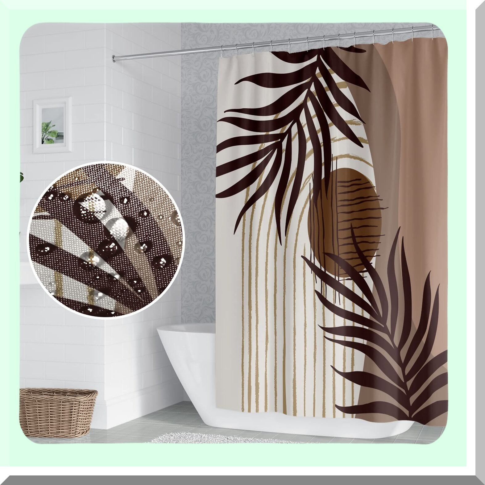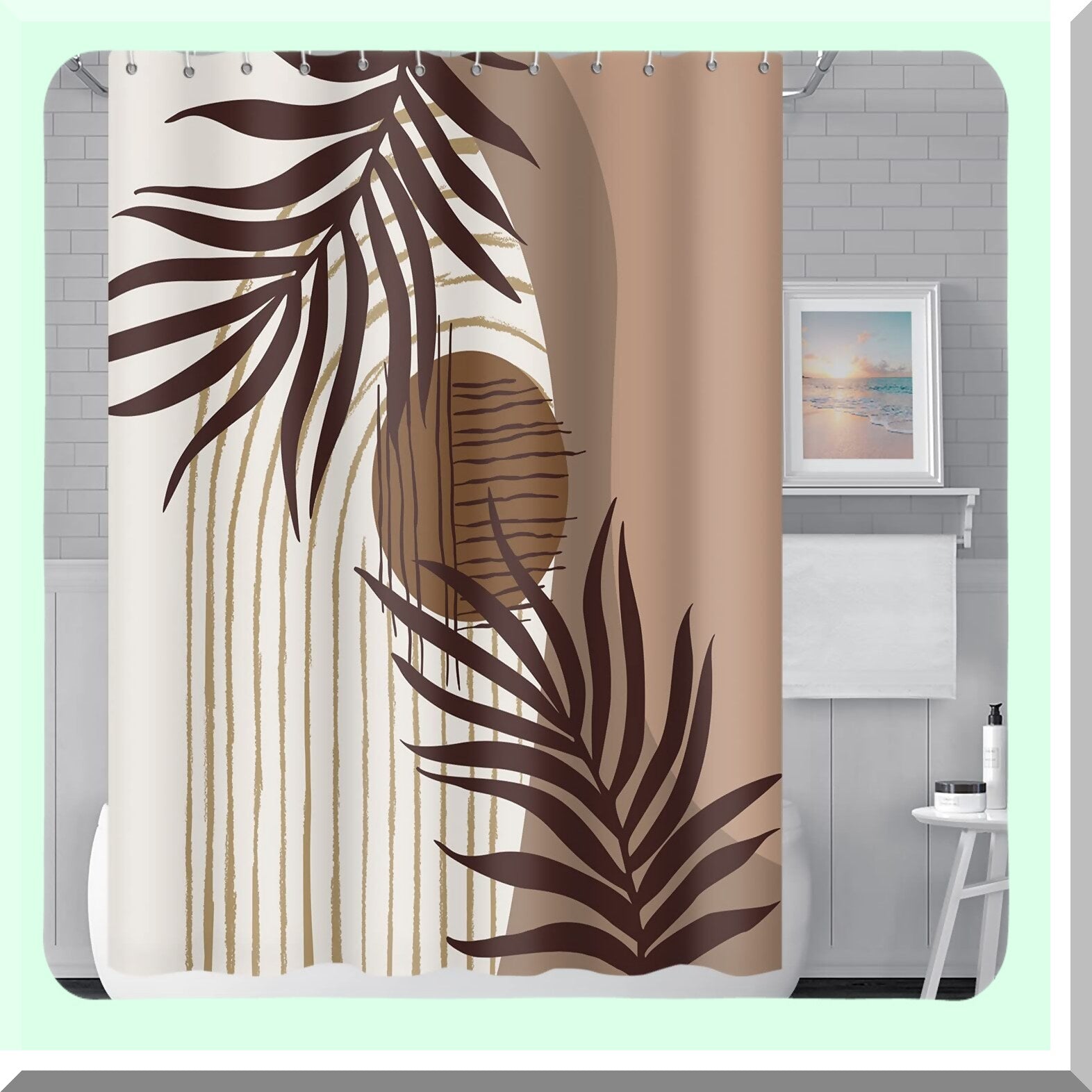 This abstract mid-century boho bathroom shower curtain features a eucalyptus leaves design in brown and beige tones, adding a touch of artful decor to your space. Made from waterproof polyester fabric, it measures 72x72 inches and includes 12 plastic hooks for easy installation. The curtain is suitable for various sizes, with options ranging from 36W to 72W inches in width and heights from 72 to 84 inches, accommodating different shower spaces. It is machine washable at temperatures below 30°C, can be hung to dry naturally, and should be ironed on the back at low temperature with a dry cloth. Slight color variations may occur due to monitor differences and lighting conditions. Custom sizes are available, but returns and cancellations are not permitted for custom orders. Please measure carefully before purchasing. This curtain offers a stylish and functional addition to your home decor.