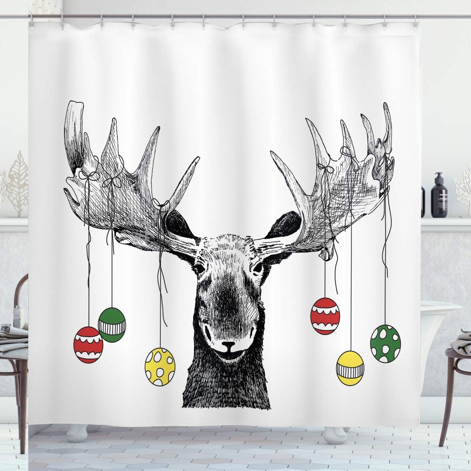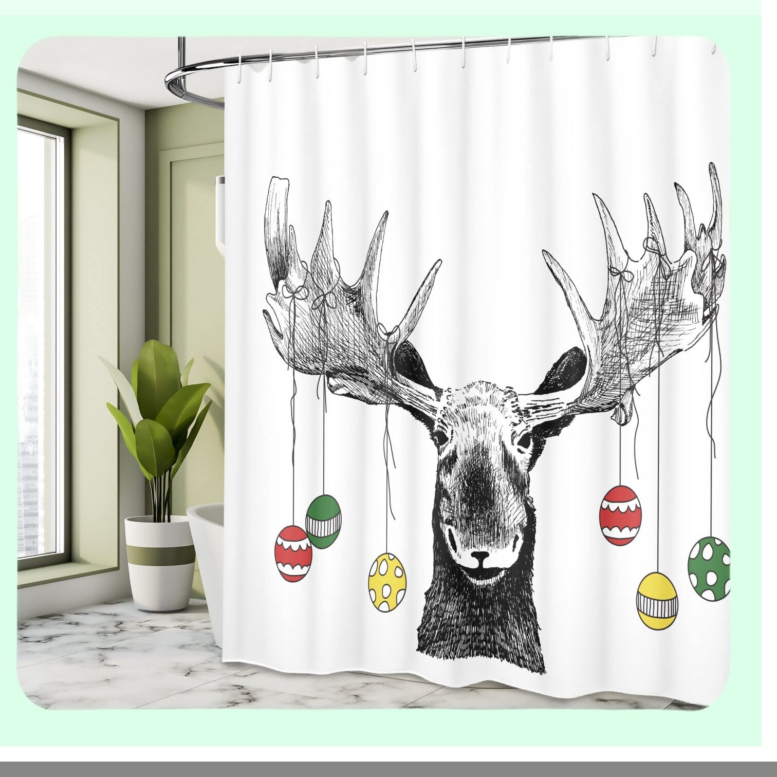Transform your bathroom with this whimsical shower curtain featuring a moose adorned with Christmas ornaments hanging from its horns. Crafted from durable cloth fabric, it measures 69 inches wide by 84 inches long, providing ample coverage. The multicolor black design offers a modern, eye-catching look that complements various bathroom accessories such as towels, rugs, and mats. Its high-resolution digital printing creates a realistic, 3D-like appearance, adding depth and vibrancy to your space. Water-resistant and quick-drying, this curtain is practical for everyday use. Easy to install with included hooks, it offers a simple way to refresh your bathroom decor without significant expense. Perfect for creating a festive, fun atmosphere, it makes an ideal gift for loved ones or a delightful treat for yourself. Please note slight measurement variations may occur due to manual measurement, and color differences might exist between the product and digital images.