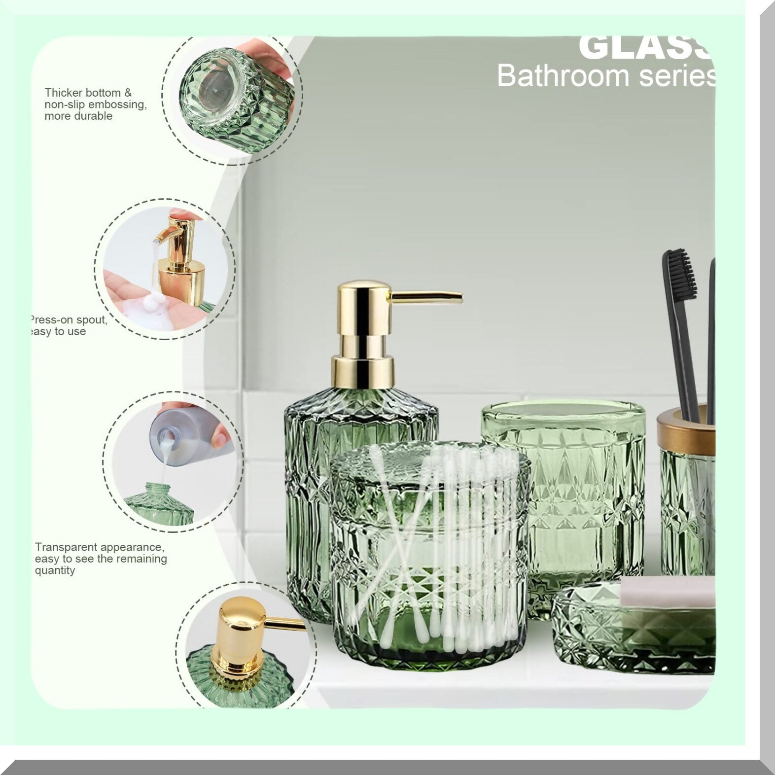 This 5-piece bathroom accessories set features vibrant green items designed to keep your space organized and stylish. Included are a lotion soap dispenser, soap dish, toothbrush holder, tumbler, and cotton swab jar. Made from durable glass, ABS, and stainless steel, these accessories are suitable for wet environments and resist mold and rust. The glass components are heavy and stable, with tight-fitting lids to prevent leaks, while the gold-coated ABS pump adds a touch of elegance. The wide-mouth design of the bottles allows for easy filling and cleaning, and the translucent glass makes it simple to monitor remaining contents. These multifunctional pieces can be used together or separately across bathrooms, kitchens, offices, or hotels. Easy to clean with just water or detergent, they are reusable and maintain their appearance over time. This set makes a practical and attractive gift for housewarmings, family, friends, or colleagues.