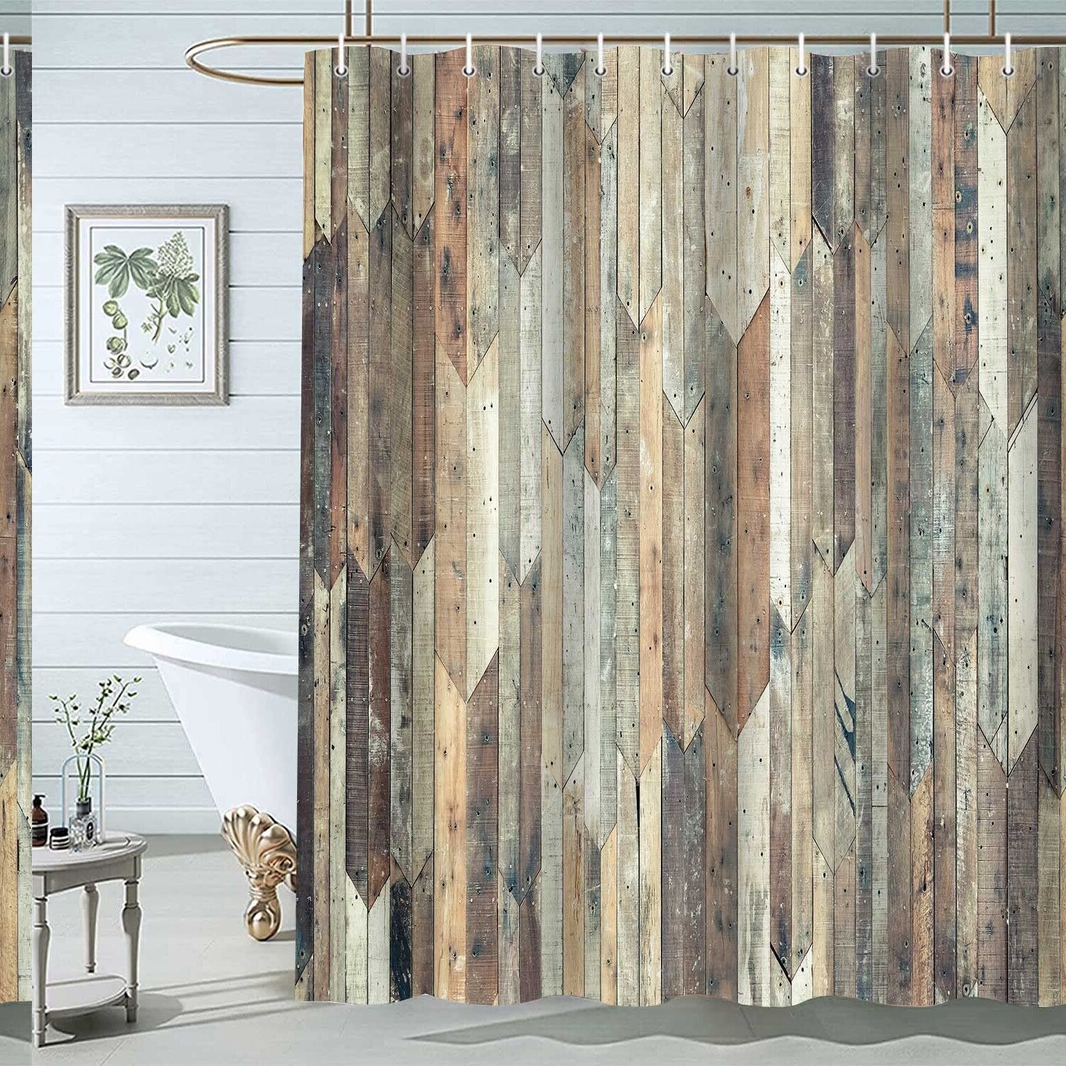 This rustic wood plank shower curtain measures 72 x 72 inches and is crafted from premium 100% polyester fabric. Designed to resemble old wooden boards, it adds a charming country farmhouse touch to any bathroom. The waterproof fabric ensures effective water resistance, while the bright colors remain vibrant and do not fade over time. Easy to use, the set includes 12 type C plastic hooks for simple installation. Its shading feature provides privacy and helps keep water contained within the shower area. The curtain's durable material and bright, rustic design make it a practical and stylish addition to your bathroom decor. Please note that slight color variations may occur due to lighting and display differences. If any issues arise upon receipt, prompt customer service is available to assist. Enhance your bathroom with this charming, waterproof wooden board-inspired shower curtain for a cozy, rustic ambiance.