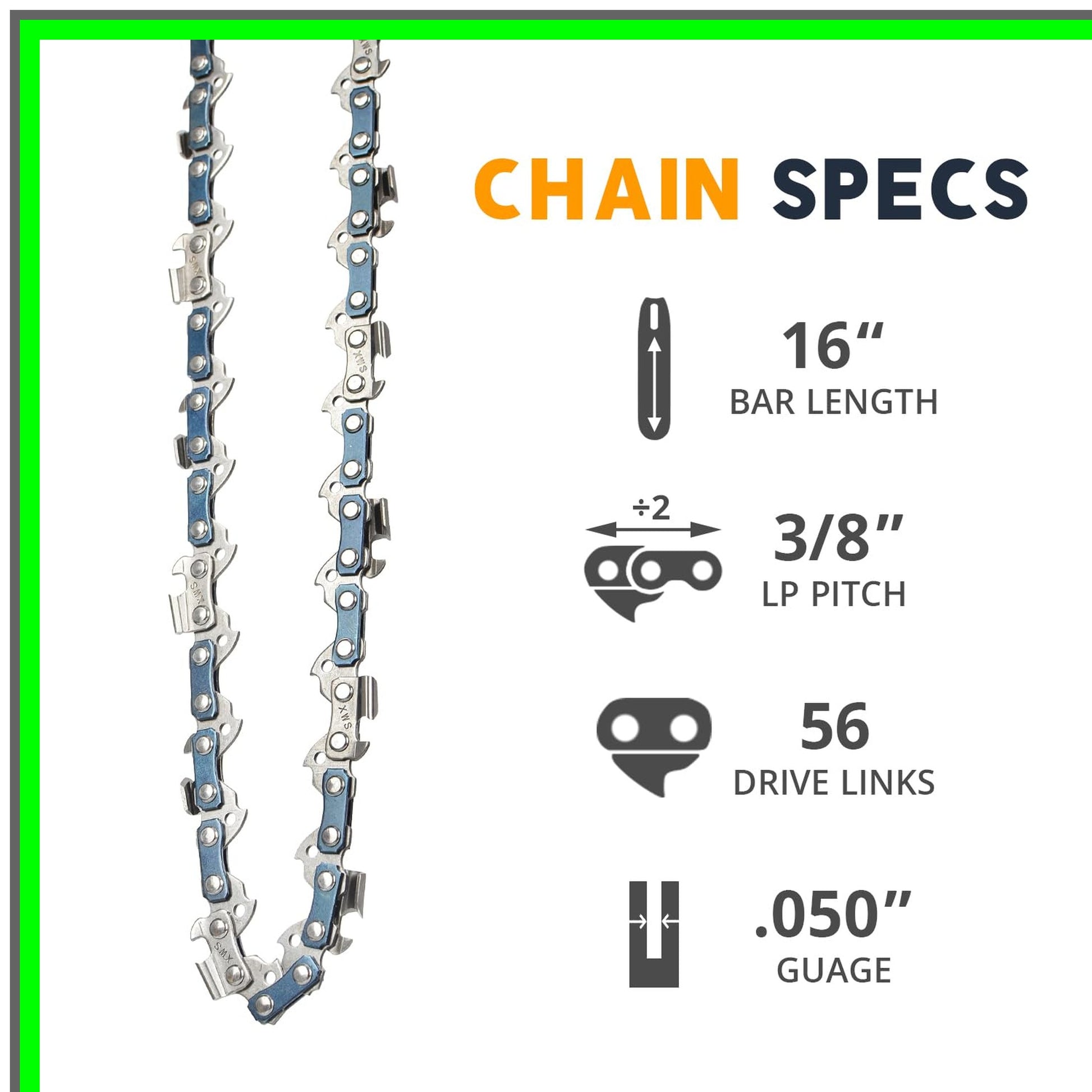 16 Inch Chainsaw Chains 3 Pack 3/8 LP Pitch 050 Gauge Fits Multiple Brands