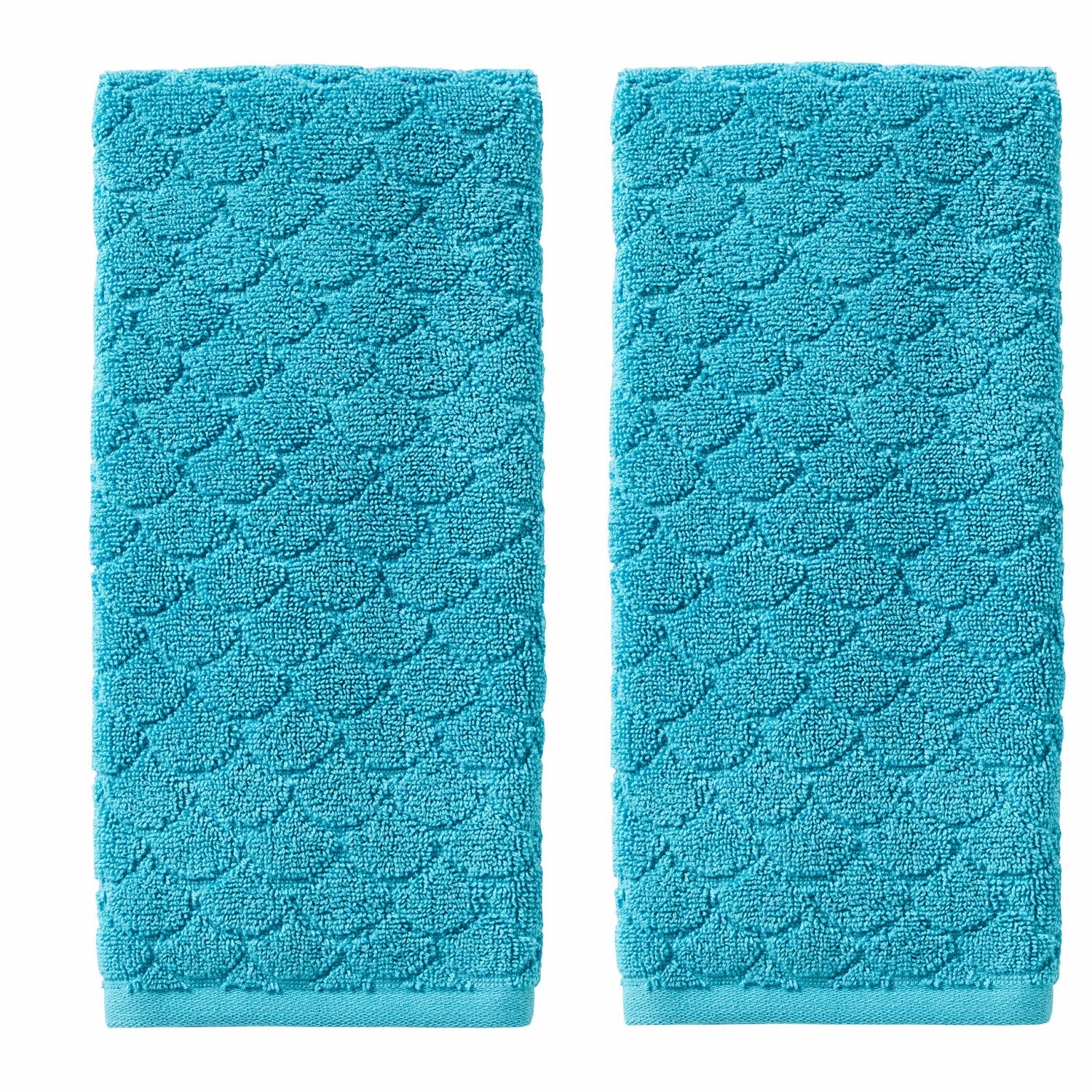 This set includes two vibrant hand towels featuring a colorful underwater design inspired by coral reefs. Made from soft, absorbent 100% cotton terry, these towels measure 16" x 26" and showcase a jacquard scale pattern reminiscent of fish and mermaid scales. The bright, lively colors bring a cheerful touch to any bathroom decor. Designed for everyday use, these towels combine functionality with eye-catching style. The set offers a playful and dynamic look, perfect for adding personality to your space. Additional matching towels and accessories are available separately to complete the look. Crafted with quality materials, these towels are durable and comfortable, making them a practical yet decorative addition to your bathroom essentials. Whether you want to refresh your space or add a splash of color, this 2-pack provides a fun and functional solution.