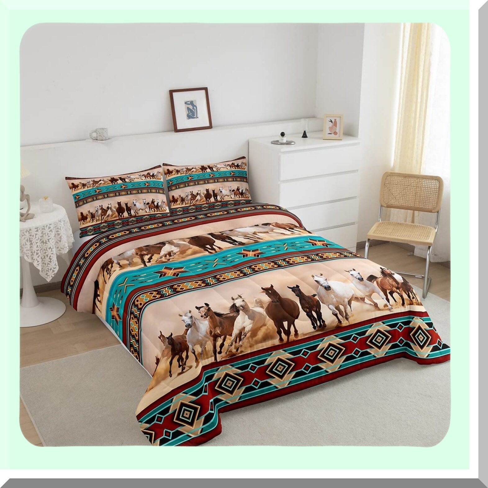 Transform your bedroom into a boho paradise with this wild farm horse print comforter set! This 3-piece set features a unique design that will add a touch of whimsy to your space. The set includes a cozy comforter, along with matching shams for a complete look. Perfect for horse lovers or anyone looking to add a rustic, yet stylish, element to their decor. Embrace your wild side with this one-of-a-kind comforter set.