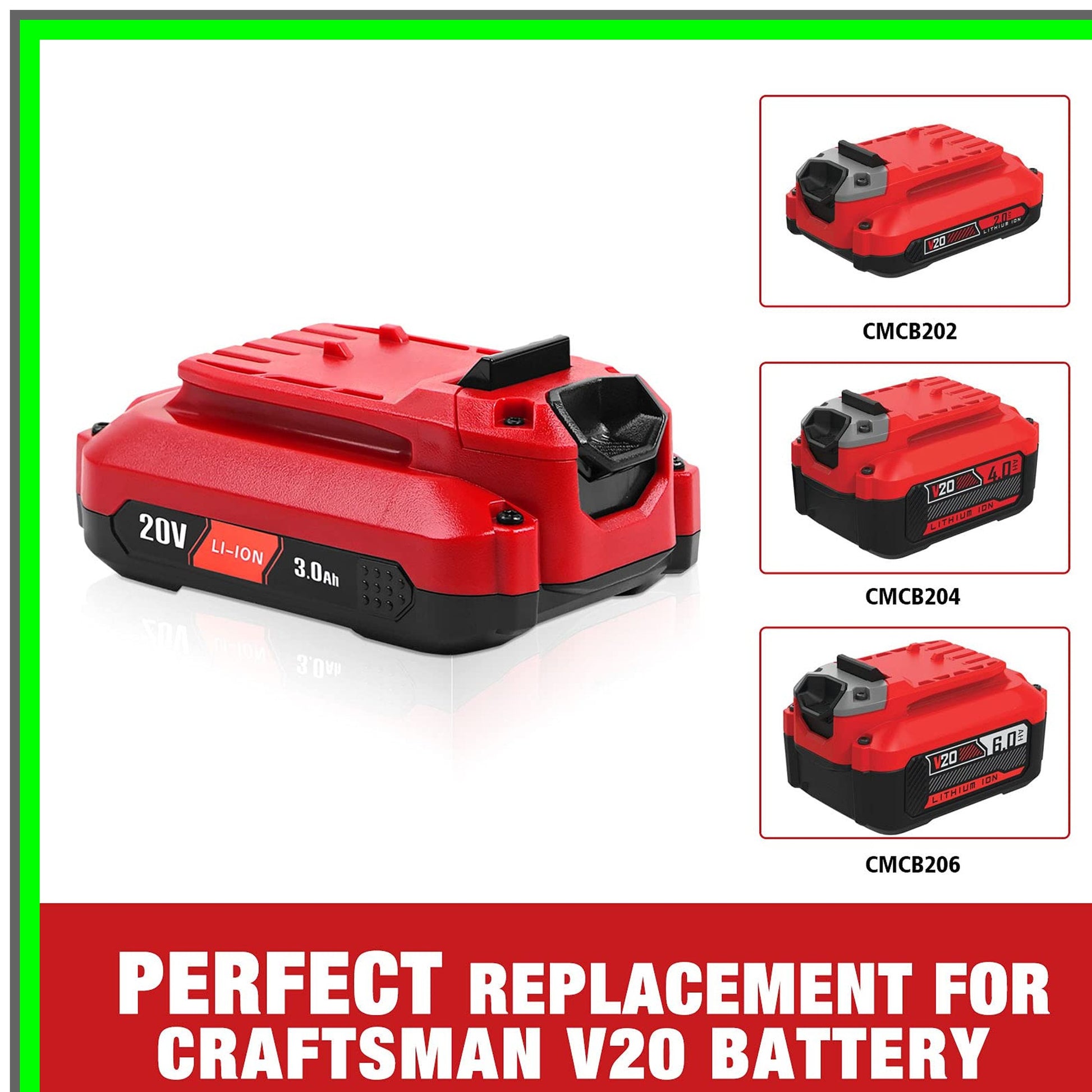Introducing the ultimate power solution for your V20 cordless tools: the 20V 3000mAh MAX Lithium Ion Battery Replacement. Engineered for peak performance, this high-capacity battery is designed specifically for the V20 series, ensuring compatibility with models like CMCB204, CMCB202, and CMCB201. With a robust 3000mAh capacity and a reliable 20V output, you can tackle any project with confidence, whether it's cutting, drilling, or blowing debris away.This lithium-ion battery not only delivers exceptional power but also features a sleek red and black design that complements your tools. It’s the perfect companion for a variety of V20 cordless power tools, including chainsaws, impact wrenches, loppers, pole saws, and more. Say goodbye to interruptions and hello to efficiency, as this battery provides the longevity you need to complete your tasks without frequent recharges.To ensure optimal performance and longevity, proper battery maintenance is essential. Store your battery in a cool, dry place, away from heat sources and flammable materials. If you’re not using it for an extended period, remember to recharge it every month to keep it in top condition.Included in your purchase is one 20V 3000mAh MAX replacement lithium-ion battery and a user manual to guide you through setup and maintenance. Elevate your power tool experience with this reliable battery replacement, designed to keep your V20 tools running at their best. Don’t let a dead battery slow you down—power up with our high-performance lithium-ion solution today!