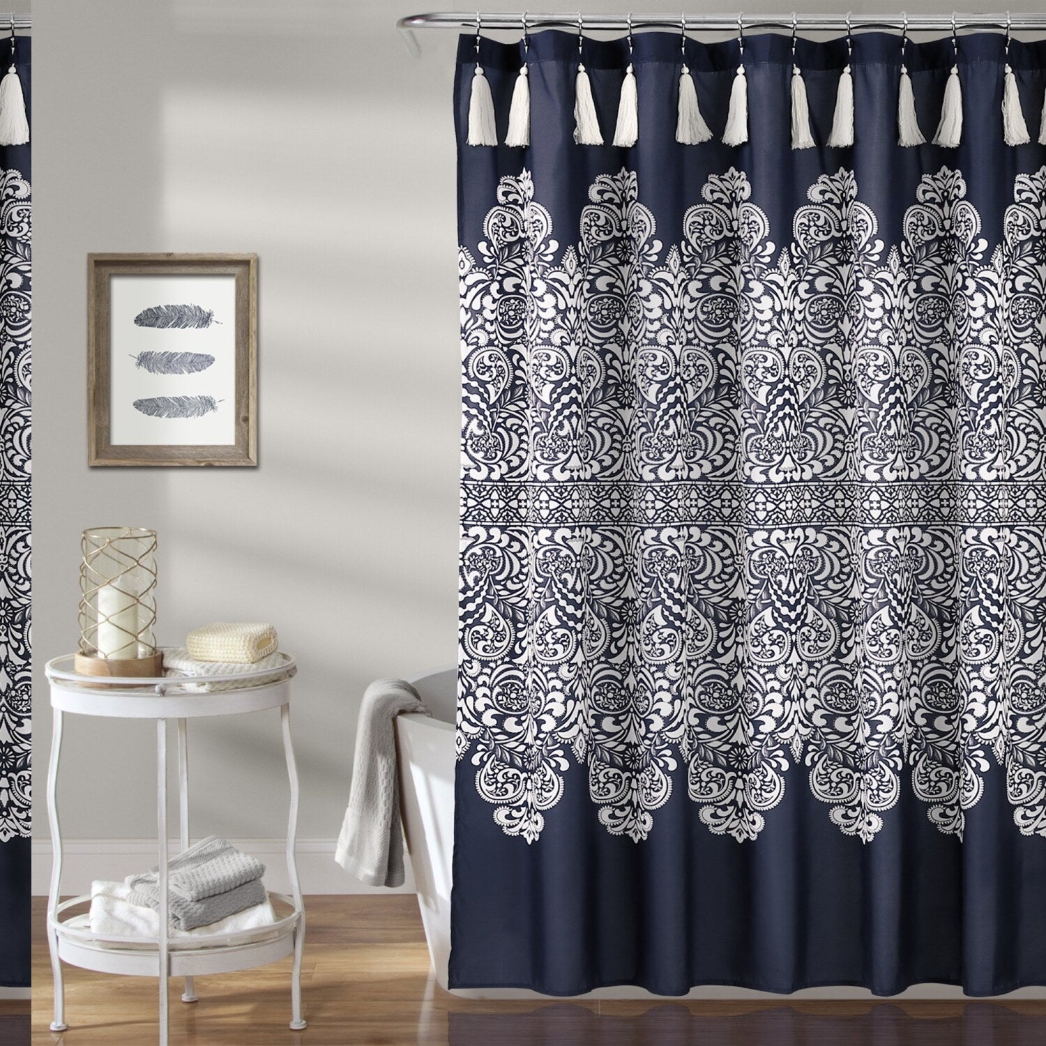 This 72" x 72" navy shower curtain features a bold boho medallion print design, complemented by playful tels spread across the top. Crafted from fabric, it showcases a stylish and eye-catching pattern that combines modern and boho aesthetics. The medallion print adds a touch of elegance, making it a striking focal point in any bathroom. Its vibrant navy color enhances the overall look, creating a lively and inviting atmosphere. Perfect for adding a touch of bohemian charm, this shower curtain is both functional and decorative. The fabric material ensures durability and a soft feel, making it a practical choice for everyday use. Whether updating your bathroom decor or adding a statement piece, this curtain offers a blend of style and personality. Its bold design and rich color make it suitable for various bathroom styles, elevating the space with a unique and fashionable touch.
