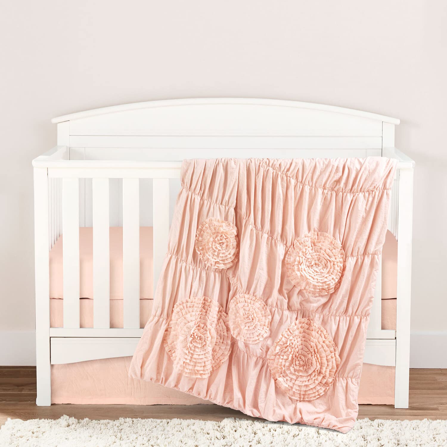 Elevate your child's nursery or toddlers room with this soft STANDARD 100 by OEKO-TEX bedding set featuring 3 lovely, coordinated pieces. The quilt features large hand crafted ruched flowers for a versatile design that will fit any dcor.