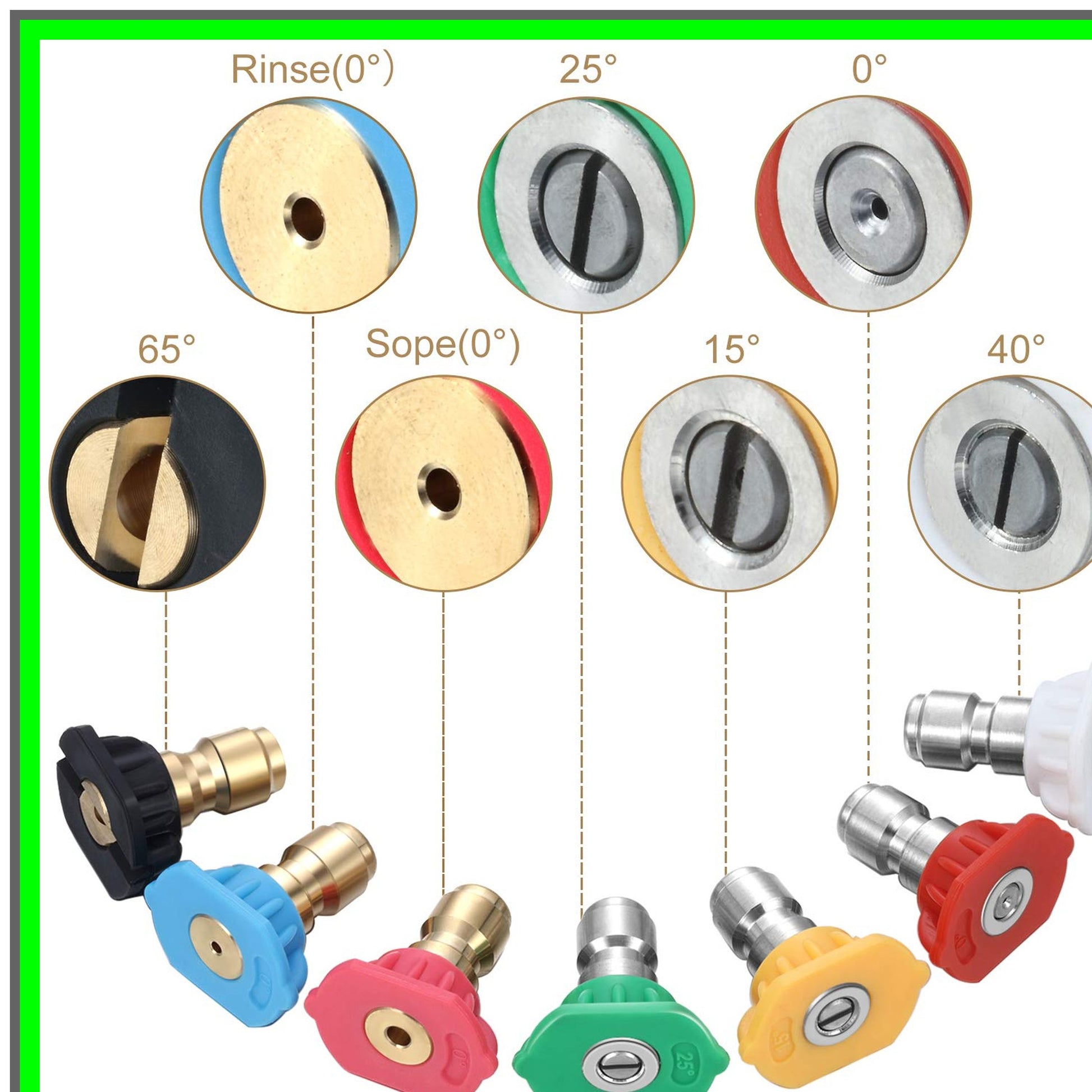 Elevate your cleaning game with our high-performance 4000 PSI Pressure Washer Rotating Turbo Nozzle, designed for efficiency and versatility. This turbo nozzle features a robust 4.0 GPM flow rate and a 1/4 inch quick connector, making it compatible with most pressure washers up to 4000 PSI. Whether you're tackling tough grime on concrete, bricks, or paving stones, this nozzle is your ultimate cleaning companion.Included in the kit are seven interchangeable spray nozzle tips, each tailored for specific cleaning tasks. The vibrant color-coded tips allow you to switch effortlessly between different spray patterns: the red tip delivers a concentrated 0-degree jet for stubborn stains, while the yellow (15-degree) and green (25-degree) tips provide powerful streams for medium-duty cleaning. For broader coverage, the white (40-degree) and black (65-degree) tips are perfect for rinsing larger areas, and the pink and blue tips are designed for soap application and rinsing, respectively.Crafted with a durable ceramic core and a rubber exterior, this turbo nozzle is built to withstand the rigors of outdoor cleaning. Its stainless steel nozzle tips ensure longevity and resistance to wear, making it a reliable choice for both residential and commercial use. Ideal for washing cars, cleaning house exteriors, and maintaining outdoor spaces, this pressure washer accessory is a must-have for any cleaning arsenal. Please note that small components are included, so keep them out of reach of children. Transform your cleaning routine with this powerful, versatile turbo nozzle kit and experience the difference in performance and efficiency!