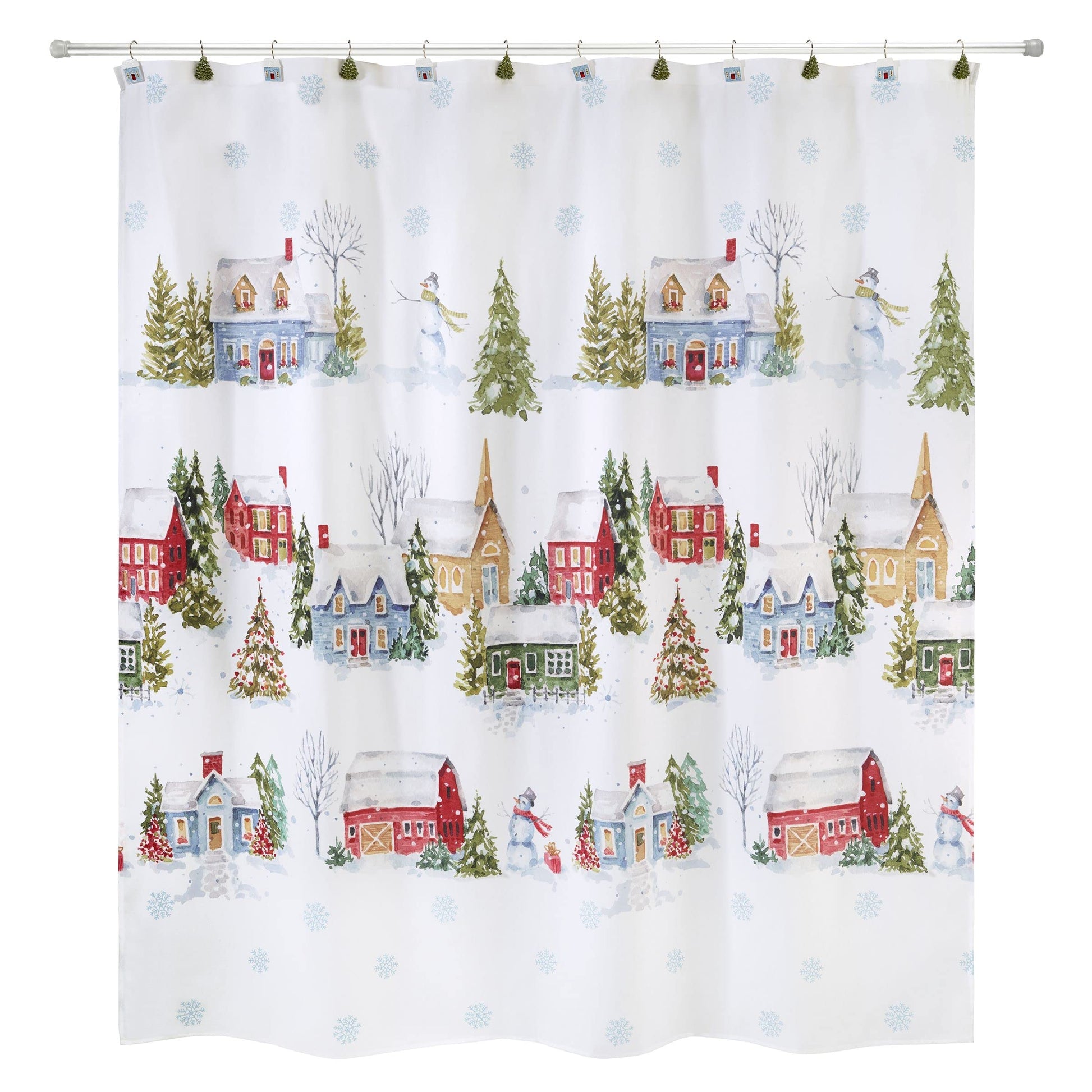 The Warm Welcome 13-Pc. Shower Curtain Shower Hook Set features a curtain with a delightful winter village scene of colorful houses and barns. on 100% polyester for easy care, 72" x 72". Set of 12 shower hooks, 2 designs 6 of each)-holiday house and snow-covered green pine tree.
