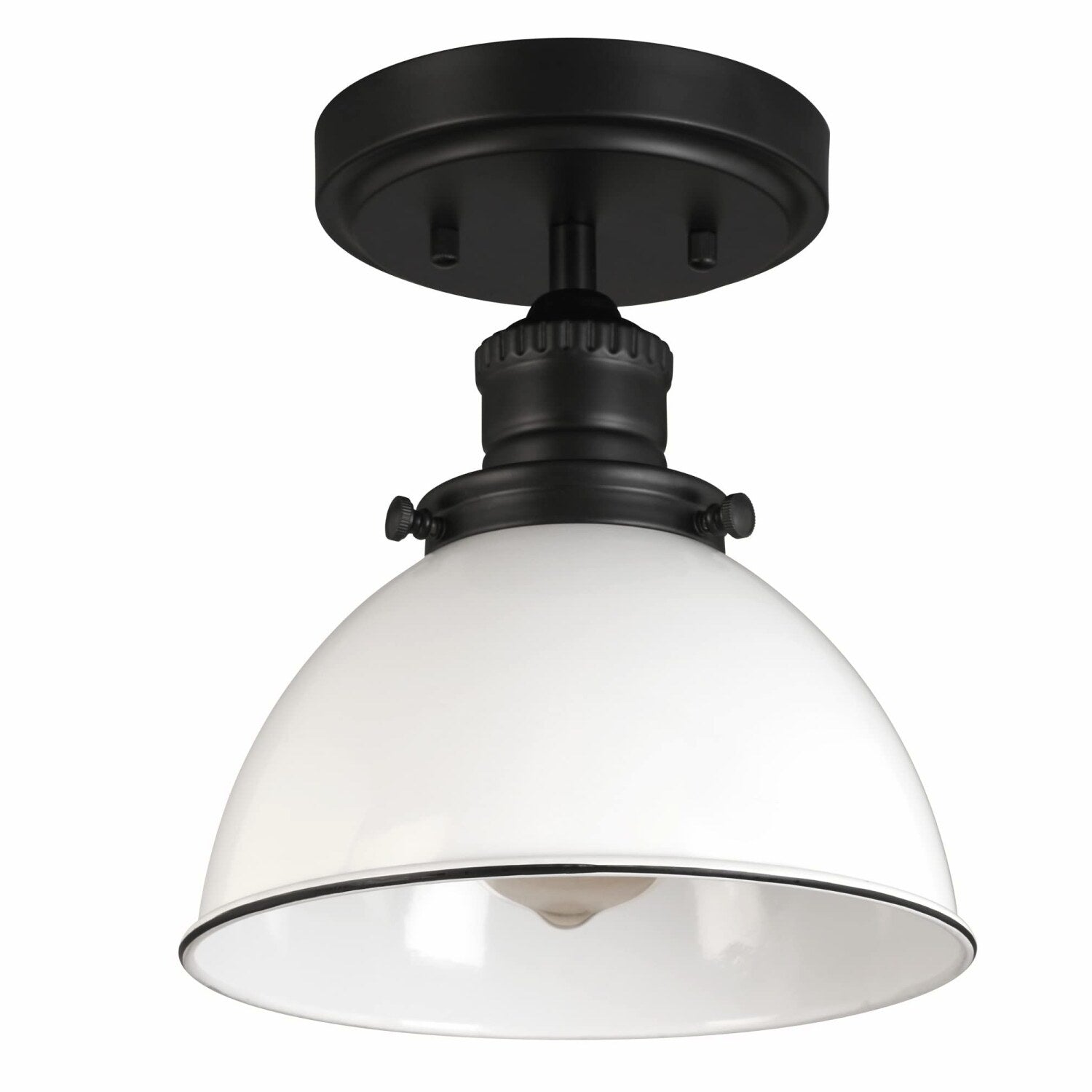 The Savannah Farmhouse 1-Light Indoor Semi-Flush Mount Ceiling Light features a white metal shade with subtle black trim and a matte black finish, combining rustic and modern farmhouse styles. Its bowl-shaped shade is designed for a single bulb, making it suitable for kitchens, bedrooms, hallways, dining rooms, foyers, and cafes. The fixture measures 9 inches in height, 8 inches in width, and 8 inches in depth. It uses a 60-watt medium base bulb or LED equivalent (not included) and is dimmable when used with a compatible dimmer switch (not included). The design allows for adjustable brightness to suit various settings. This ceiling light is UL listed for use in dry locations, ensuring safety and quality. Its simple yet charming appearance makes it a versatile addition to many interior spaces, providing functional illumination with a rustic-modern aesthetic.