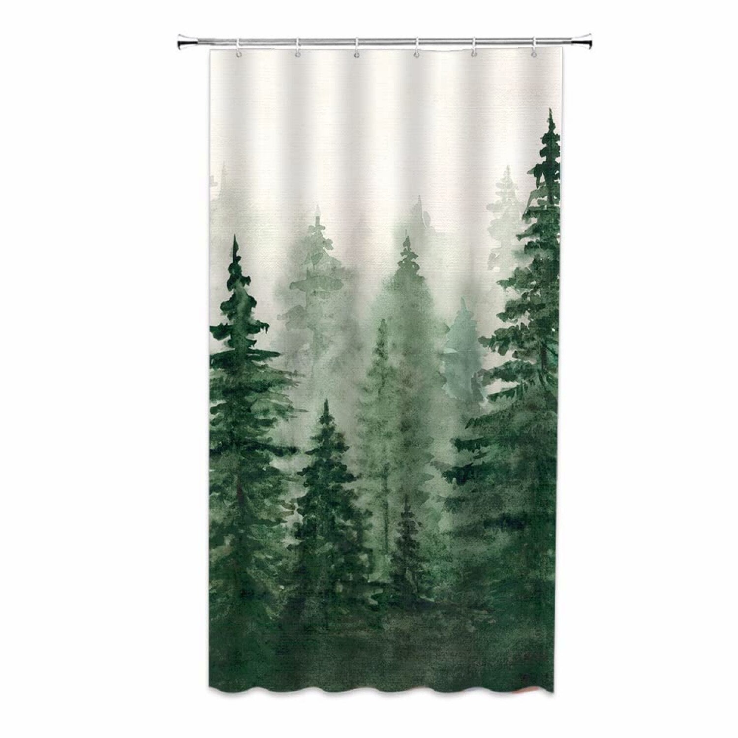 This rustic forest shower curtain features a watercolor depiction of pine trees set against a foggy woods background, creating a fantasy nature landscape. Made from fabric, it measures 36x70 inches and is designed to add a touch of natural beauty to your bathroom decor. The curtain includes free strong plastic "C" hooks for easy installation. Please note that color variations may occur due to differences in monitor displays. Additionally, due to manual measurement, slight size differences are normal. This abstract painting-inspired design brings a calming, woodland atmosphere to your bathroom space, making it a charming addition to your home.