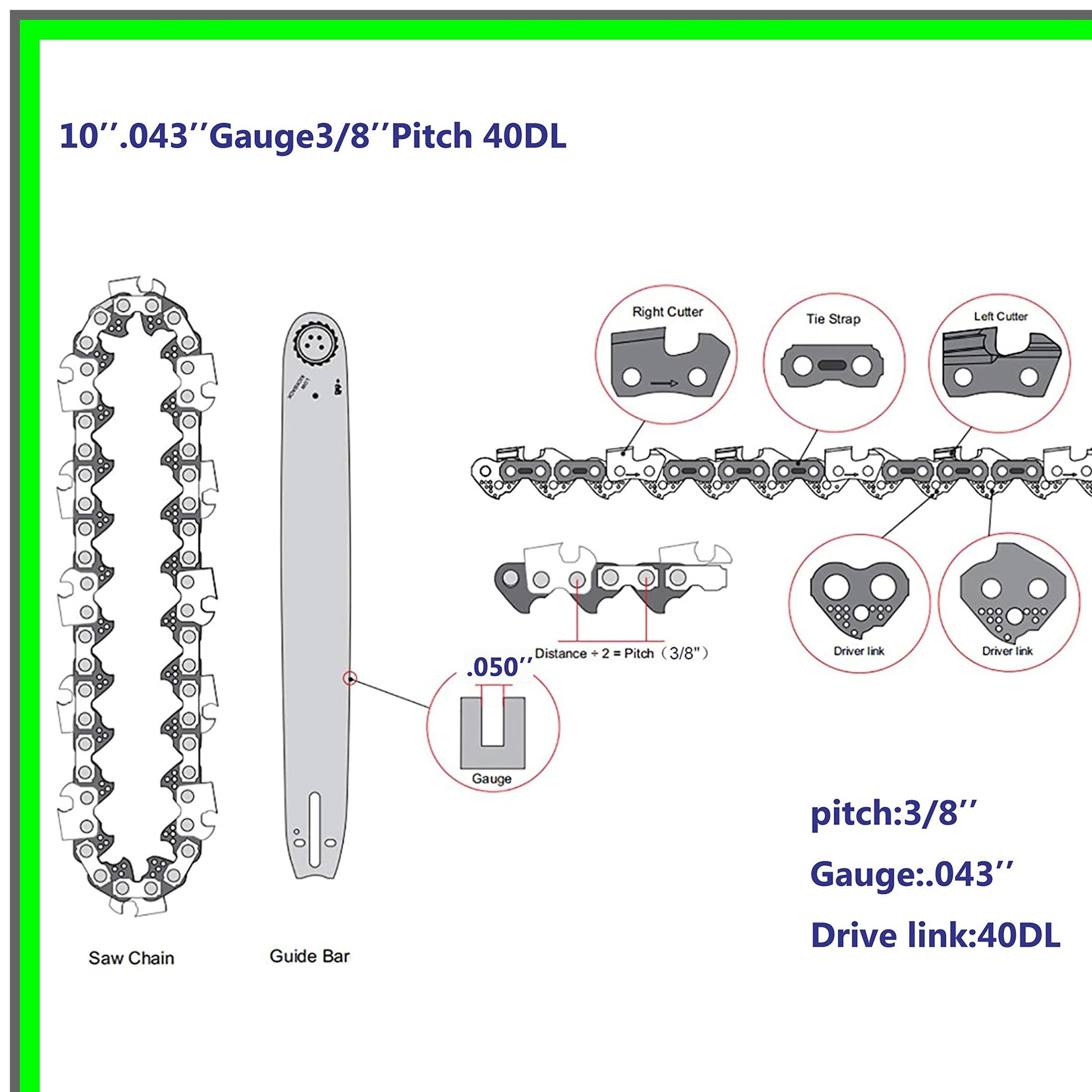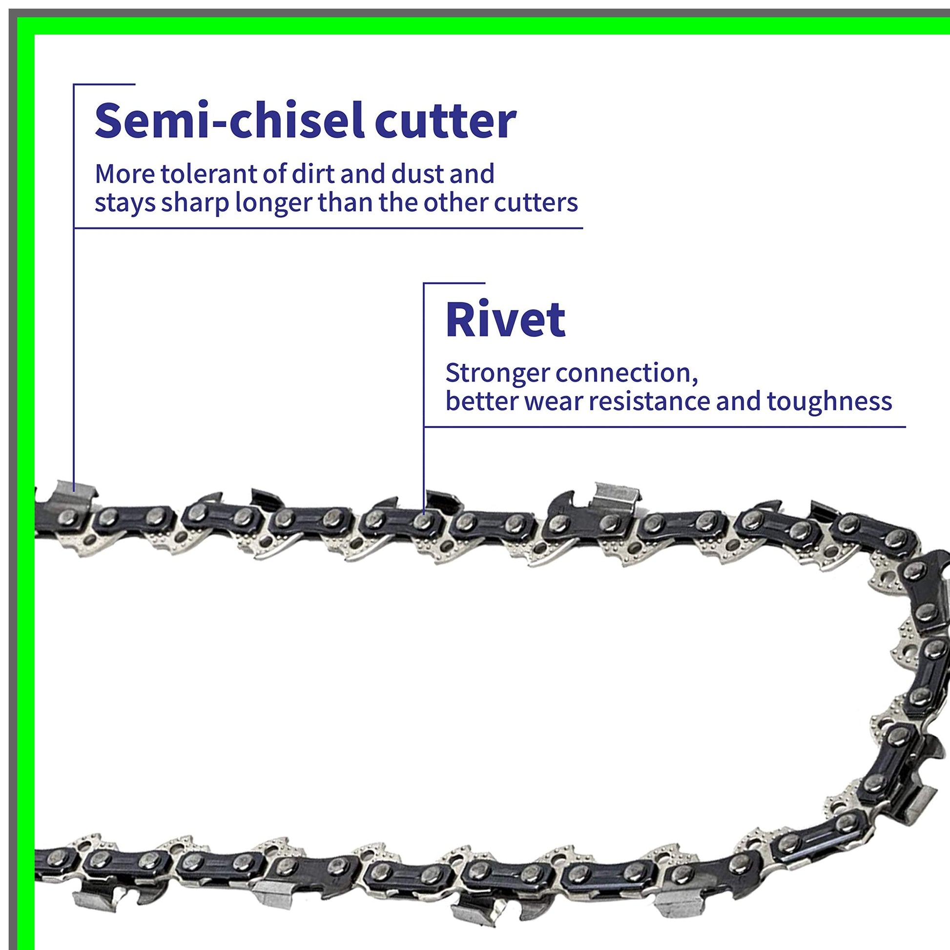 Elevate your cutting experience with our premium 10" chainsaw chain, designed for precision and durability. This 2-pack of semi-chisel chains features a 0.43" gauge and a low-profile 3/8" pitch, making it an ideal choice for both professional landscapers and DIY enthusiasts. With 40 drive links, this chainsaw chain ensures smooth operation and efficient cutting, allowing you to tackle any task with confidence.Crafted with a premium surface treatment, our chain cutters are plated with industrial hard chrome, providing a harder surface that enhances wear resistance. This means you can rely on your chainsaw chain to maintain its sharpness and performance over time. The heat-treated and quenched rivets create a robust connection between chain links, ensuring a longer lifespan and superior strength.Our innovative lubrication system keeps your chainsaw chain and guide bar well-oiled, reducing friction and extending the life of your equipment. Experience reduced vibration by 25% or more, allowing for a more comfortable cutting experience with less fatigue. Plus, the low kickback design enhances safety, making it suitable for users of all skill levels.This versatile chainsaw chain is compatible with a wide range of models, including popular brands like Ryobi, Homelite, Makita, and EGO Power+. Whether you're using a pole saw or a standard chainsaw, our product is engineered to fit seamlessly, ensuring you get the most out of your equipment.Upgrade your chainsaw with our reliable 10" chainsaw chain and enjoy effortless cutting, enhanced durability, and unmatched performance. Perfect for trimming branches, cutting firewood, or maintaining your yard, this chainsaw chain is your go-to solution for all your cutting needs.