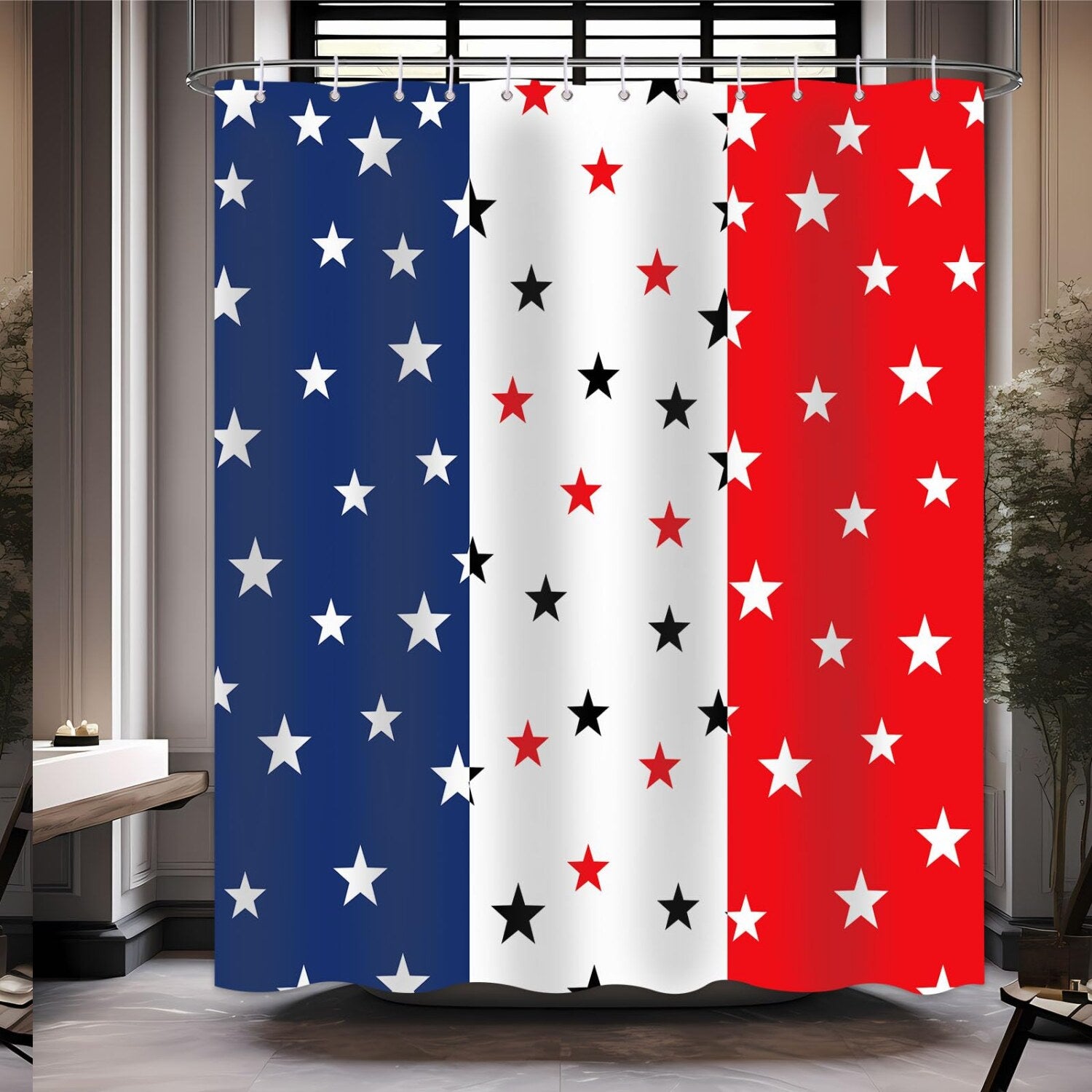 This shower curtain measures 72x72 inches and features a patriotic design with blue, white, and red stars. Made from polyester fabric, it is soft, durable, and resistant to water, promoting quick water runoff to keep your bathroom dry and clean. The 3D digital printing process creates realistic patterns that resist fading. The package includes 12 hooks for easy installation. Suitable for bathroom use, it can also serve as a door curtain, room partition, or decorative backdrop for parties. The curtain is easy to clean, machine washable, and can be hand washed, but should not be bleached. Slight color and size variations may occur due to monitor differences and manual measurement. Folded for packaging, creases are normal and can be smoothed out by air-drying or low-temperature ironing. Customization and bulk orders are available.