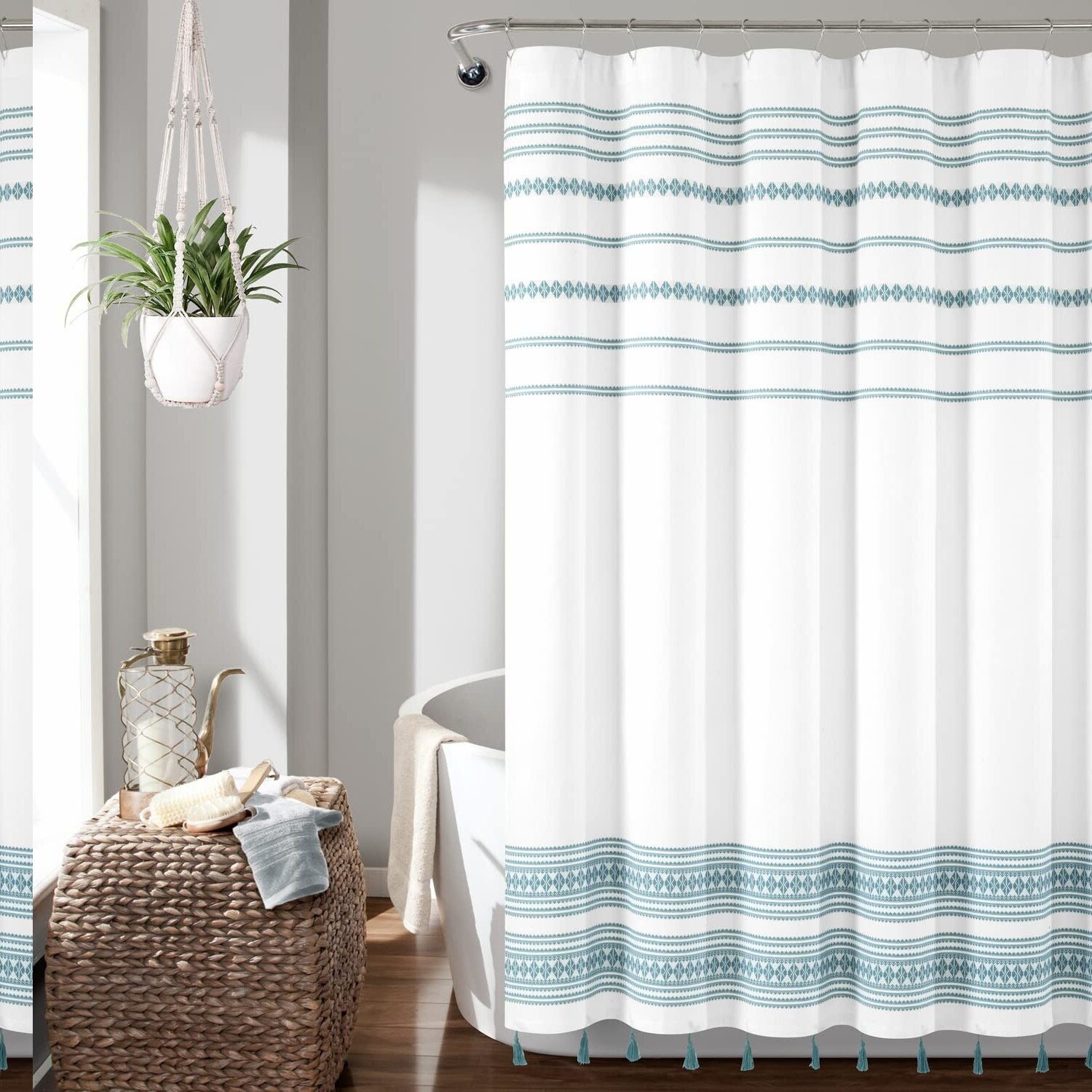 Add a touch of bohemian style to your bathroom with this textured shower curtain made from recycled cotton. Featuring a woven jacquard stripe pattern, it brings visual interest and a natural feel to your space. Decorative tassels hang from the bottom, enhancing its unique look. The curtain measures 72" x 72", providing ample coverage. Crafted from eco-friendly recycled cotton, it combines sustainability with style. Its textured design adds depth and character, making it a versatile addition to any bathroom decor. Easy to hang and maintain, this shower curtain is both functional and fashionable. Brighten up your bathroom environment with this eco-conscious, stylish piece that offers a blend of texture and decorative detail. Perfect for creating a relaxed, bohemian vibe, it is a practical and attractive choice for your shower area.