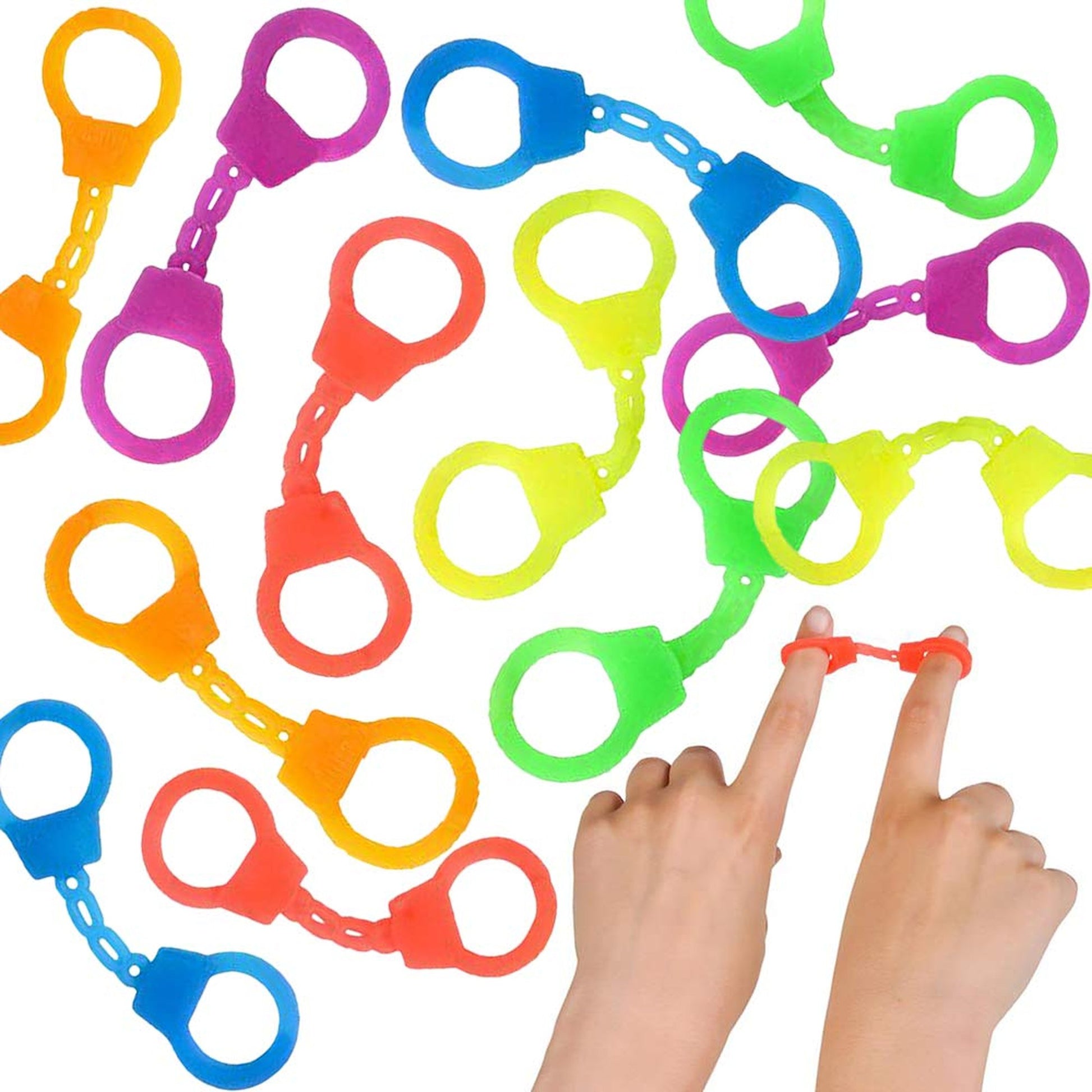 Mini stretch cuffs for kids come in a pack of 144, featuring vibrant neon colors including yellow, blue, green, coral, purple, and orange. Made from durable, stretchy rubber, these small handcuffs are perfect for imaginative play, especially themed activities like police or rescue games. They are ideal as party favors, goodie bag fillers, piΓ±ata treats, or prizes for children aged 3 and up. The bright colors add excitement to any celebration and can also serve as fun decorations. Designed to withstand active play, these mini cuffs provide hours of entertainment for kids, encouraging creative role-playing and social interaction. Whether for birthday parties, themed events, or everyday fun, these colorful rubber cuffs are a versatile addition to children's toy collections. They offer great value with their large set size and are suitable for a variety of playful activities, making them a popular choice for parents and event organizers alike.