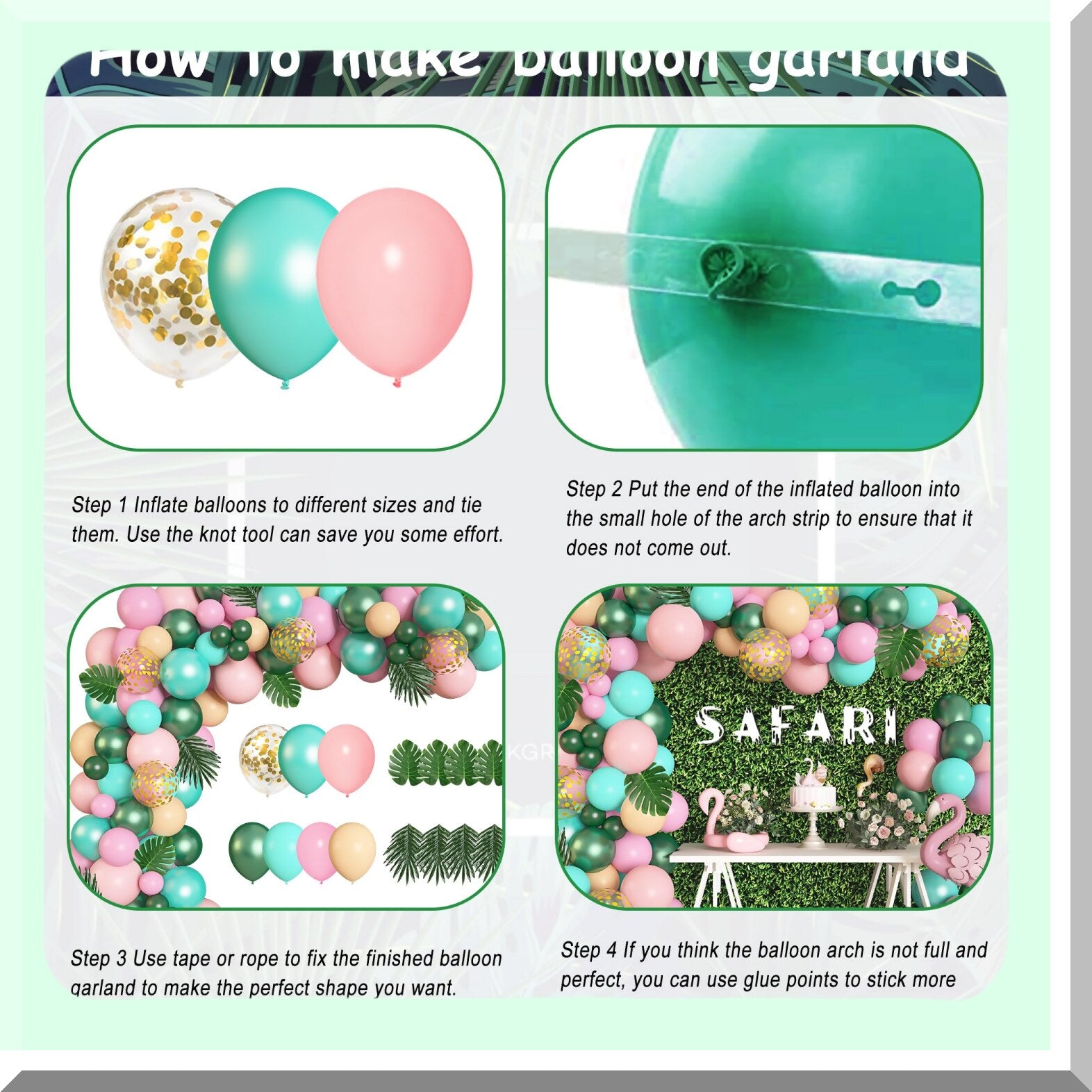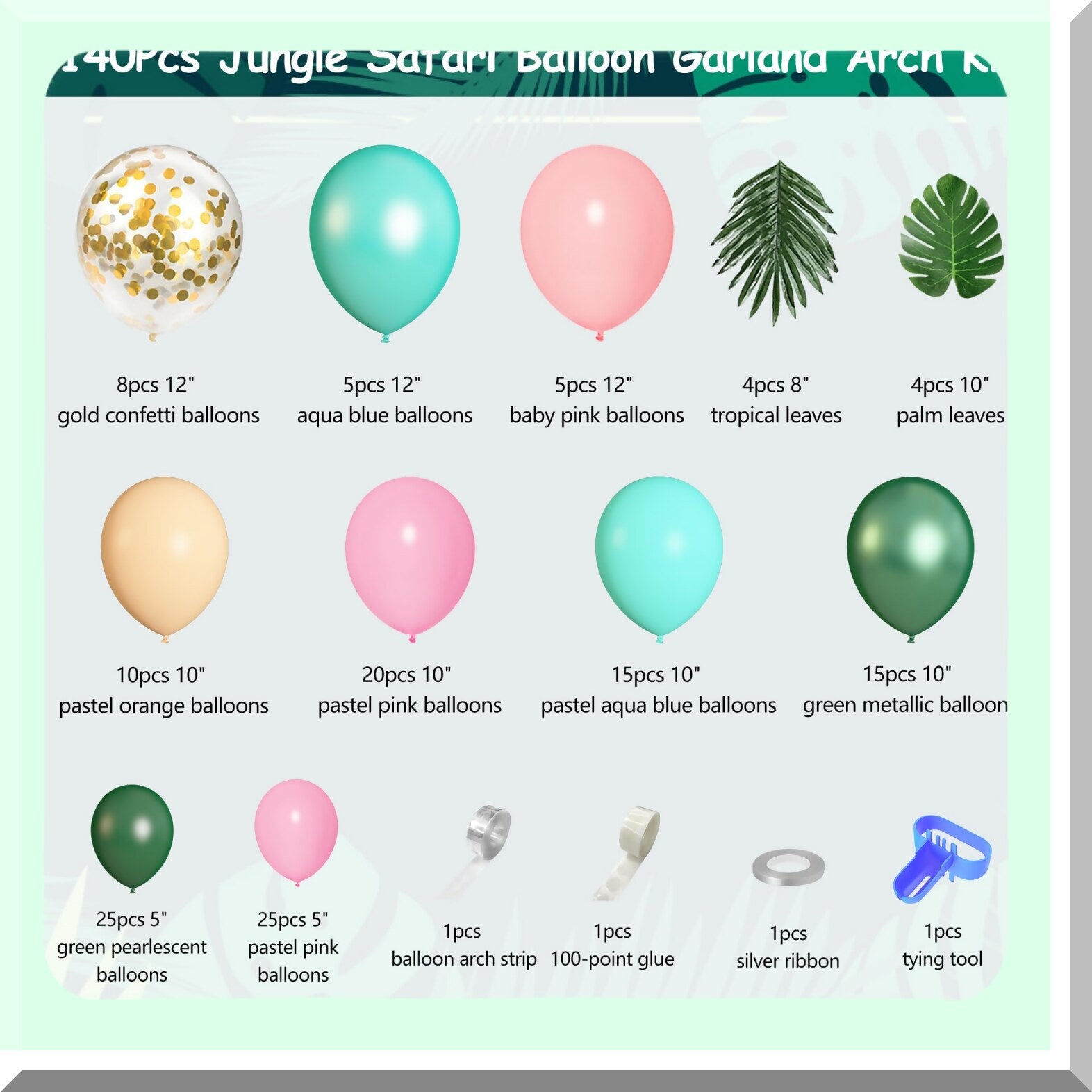 Create a vibrant tropical-themed celebration with this 140-piece jungle safari birthday supplies set. It includes a variety of balloons in pink, green, aqua blue, and orange, featuring pearlescent, metallic, and confetti designs, along with tropical leaves and palm accents. The kit contains balloons of different sizes, such as 12-inch, 10-inch, and 5-inch, to help craft a full and lively balloon arch or garland. Also included are essential tools like a balloon arch strip, tying tool, silver ribbon, and balloon points for easy setup. Made from natural latex, these balloons are durable and can hold air for several days. Perfect for decorating jungle, safari, Hawaiian, or tropical-themed parties, baby showers, birthdays, weddings, and gender reveal events. The tropical leaves add a lush, authentic touch, enhancing your decor with a lively, tropical atmosphere. This comprehensive kit provides everything needed to create impressive and festive tropical decorations effortlessly.