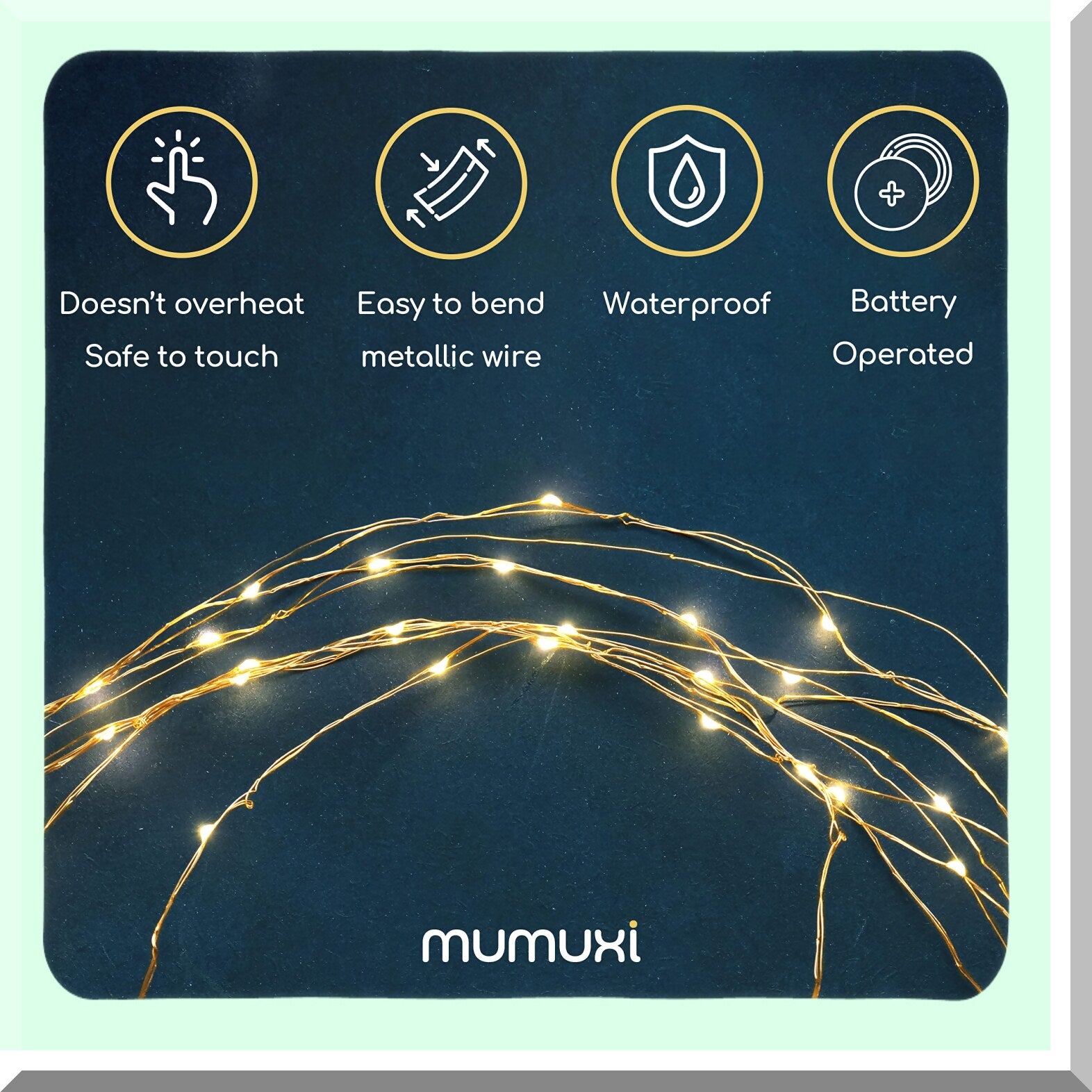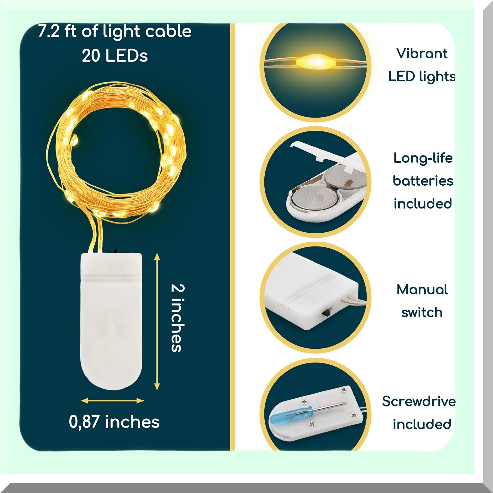 Decorate your home and special occasions with versatile mini string lights. These lights resemble delicate flies and feature flexible copper wire, allowing easy shaping around wreaths, trees, flowers, and more. Perfect for creating a relaxing ambiance in bedrooms, enhancing wedding decor, or adding a charming touch to restaurants and shops. They help attract customers by adding a twinkling, inviting glow, encouraging longer visits and a welcoming atmosphere. Ideal for parties and holidays, these lights can be placed in jars, vases, or wrapped around various objects to elevate your decor. The copper wire is waterproof, suitable for both indoor and outdoor use, while the battery box remains protected from water. Each string measures 2 meters (7.2 feet) with 20 warm white LEDs spaced 10 centimeters apart. Powered by 2 CR2032 lithium batteries included, they offer over 72 hours of illumination. Easy to operate with a simple on/off switch, these durable, bendable lights provide a safe, energy-efficient lighting solution for any setting.