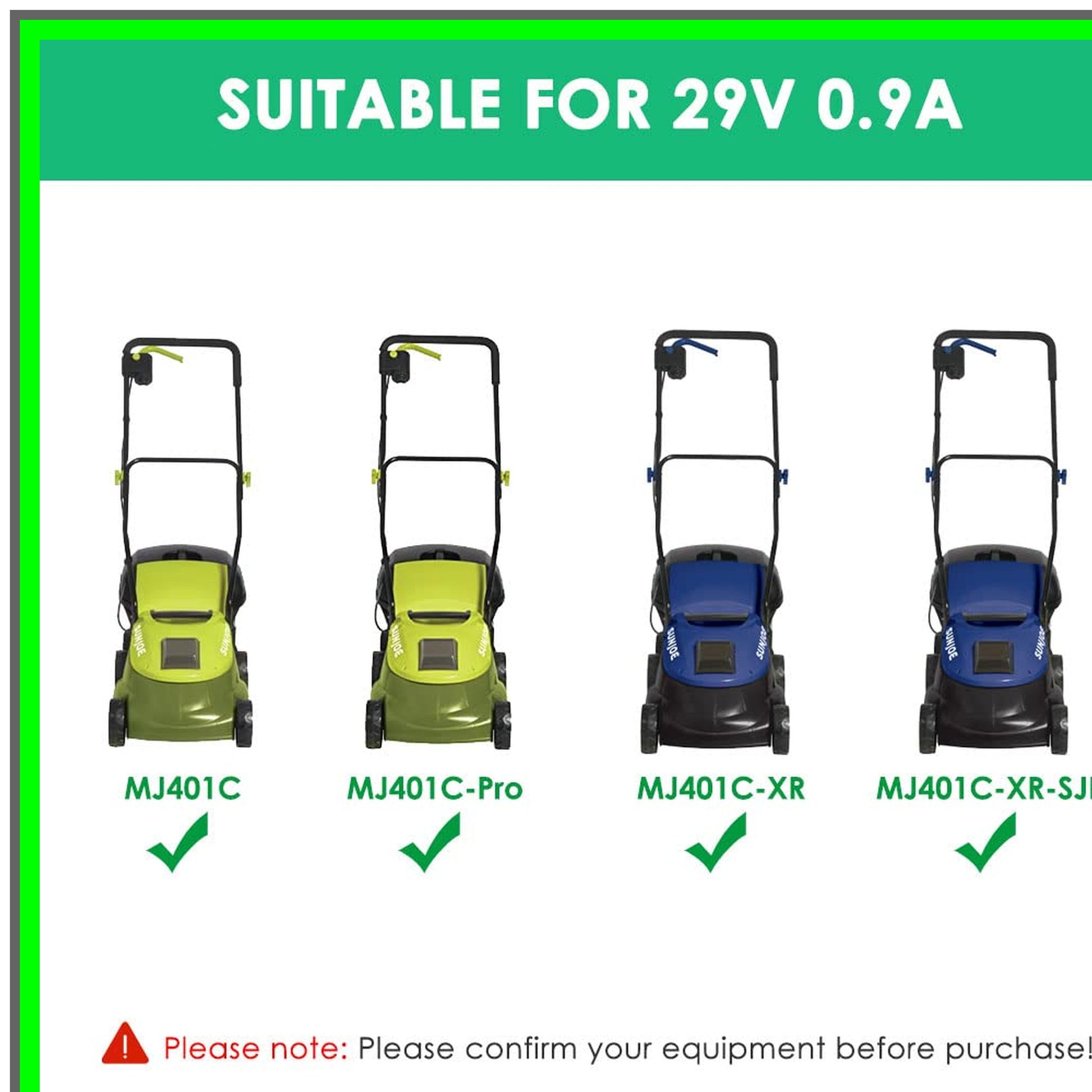 Introducing the ultimate power solution for your electric lawn mower! This high-performance replacement charger is specifically designed to be compatible with a range of Sun Joe Electric Lawn Mowers, including models MJ401C, MJ401C-XR, MJ401C-XR-SJB, and MJ401C-Pro. Say goodbye to downtime and hello to a beautifully manicured lawn with this reliable charging accessory.Engineered with versatility in mind, this charger operates on a wide input range of 100-240V and supports 50-60Hz, making it perfect for various power sources. With an output of 29V and 0.9A, it ensures efficient and safe charging, equipped with Over Voltage Protection (OVP), Over Current Protection (OCP), and Short Circuit Protection (SCP) to safeguard your mower's battery and extend its lifespan.Our commitment to quality means you can trust this charger to deliver consistent performance, allowing you to tackle your lawn care tasks with confidence. Whether you're maintaining a small garden or a larger yard, this charger is your go-to solution for keeping your mower powered and ready for action.Plus, we stand behind our product with a hassle-free one-month free return service, ensuring your satisfaction and peace of mind. Don’t let a dead battery slow you down—invest in this essential accessory and keep your lawn mower running smoothly all season long. Experience the difference in quality and reliability with our premium charger, designed to meet the needs of every lawn care enthusiast. Get ready to enjoy a lush, green lawn with ease!
