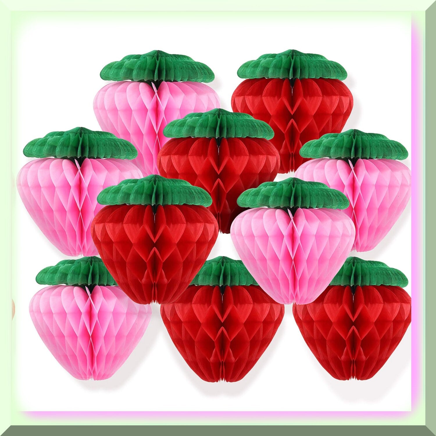 Add a touch of sweetness to your celebration with this set of 10 strawberry honeycomb balls. Each ball measures approximately 6 inches in diameter and features a vibrant red and pink design with green leaves, perfect for enhancing any event. The paper strawberries are flat and easy to assemble, with attached hanging ropes and sticky tabs for simple placement on ceilings, walls, doors, trees, fences, or other surfaces. These lightweight decorations are versatile and can be paired with other honeycomb balls and party ornaments to create a lively atmosphere. Suitable for various occasions, including birthdays, weddings, bridal events, baby showers, or home decor, they help set a festive mood. Ideal for decorating dessert tables, windows, or as photo props, these delicate paper decorations are easy to store and reuse, just keep them dry and handle with care. Bring color and charm to your next celebration with these adorable strawberry-themed decorations.