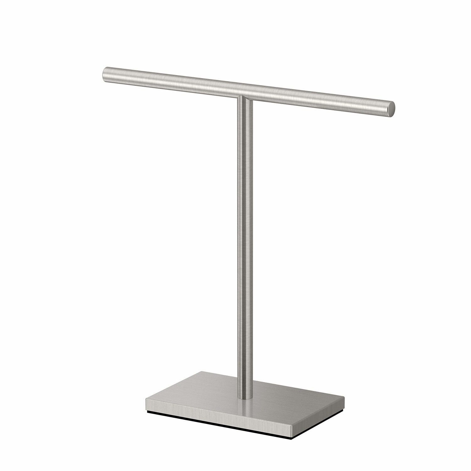 The 1444SN towel holder features a modern rectangle base and a T-shape design, standing 11.13 inches tall and measuring 10.50 inches wide. Crafted from high-quality metal, it offers durability and a sleek nickel finish that complements both modern and transitional bathroom or kitchen decor. Its freestanding design requires no installation, easily placing on any shelf, table, or countertop. The dual arm structure provides ample space for two towels, making it ideal for drying dish towels, guest towels, or fingertip towels. The weighted, padded base ensures stability and prevents scratching on surfaces, while its stylish appearance adds a touch of elegance to any space. Suitable for holding and drying towels conveniently within reach, this versatile towel holder combines functionality with a contemporary aesthetic. Its compact size makes it perfect for various settings, offering a practical solution for towel organization and display.