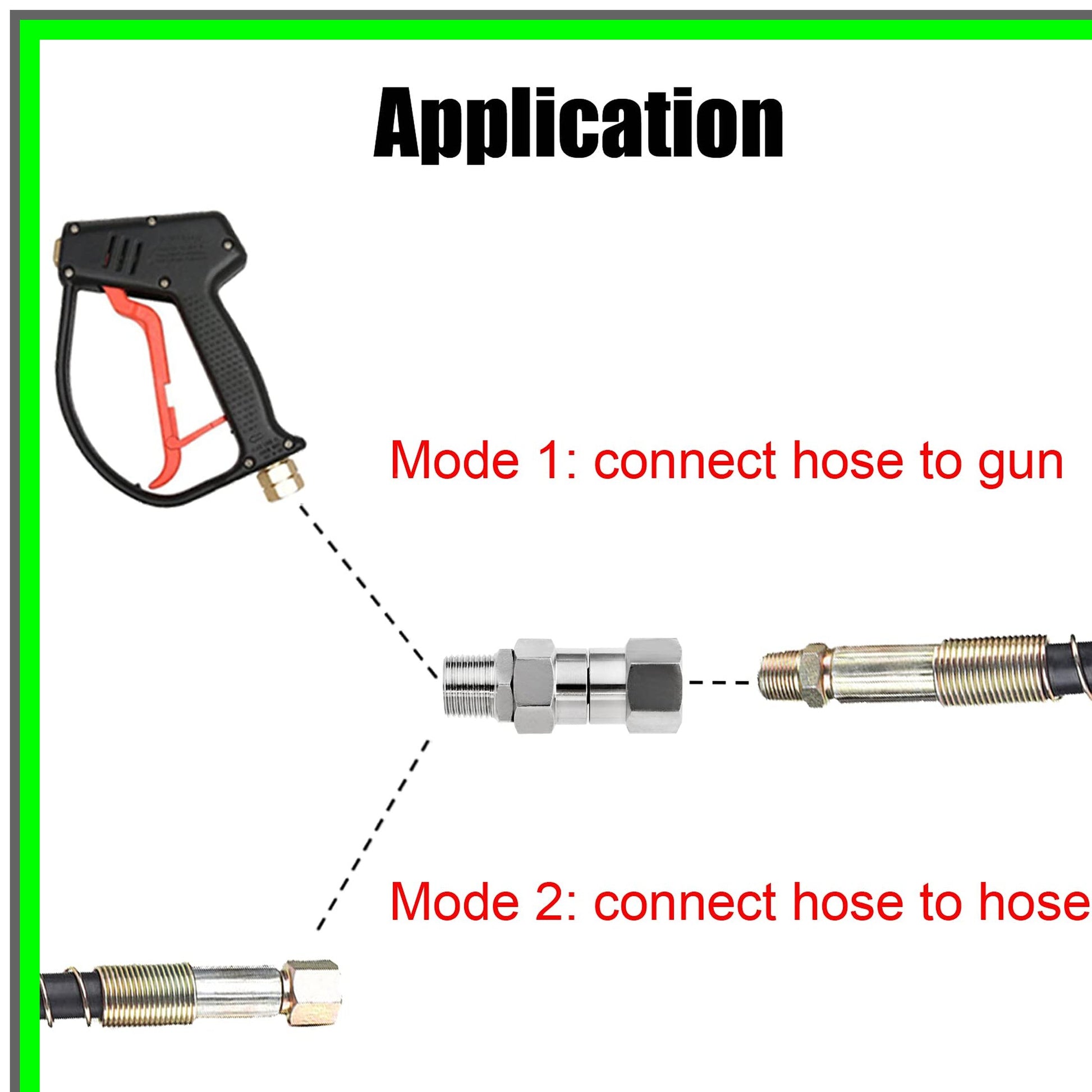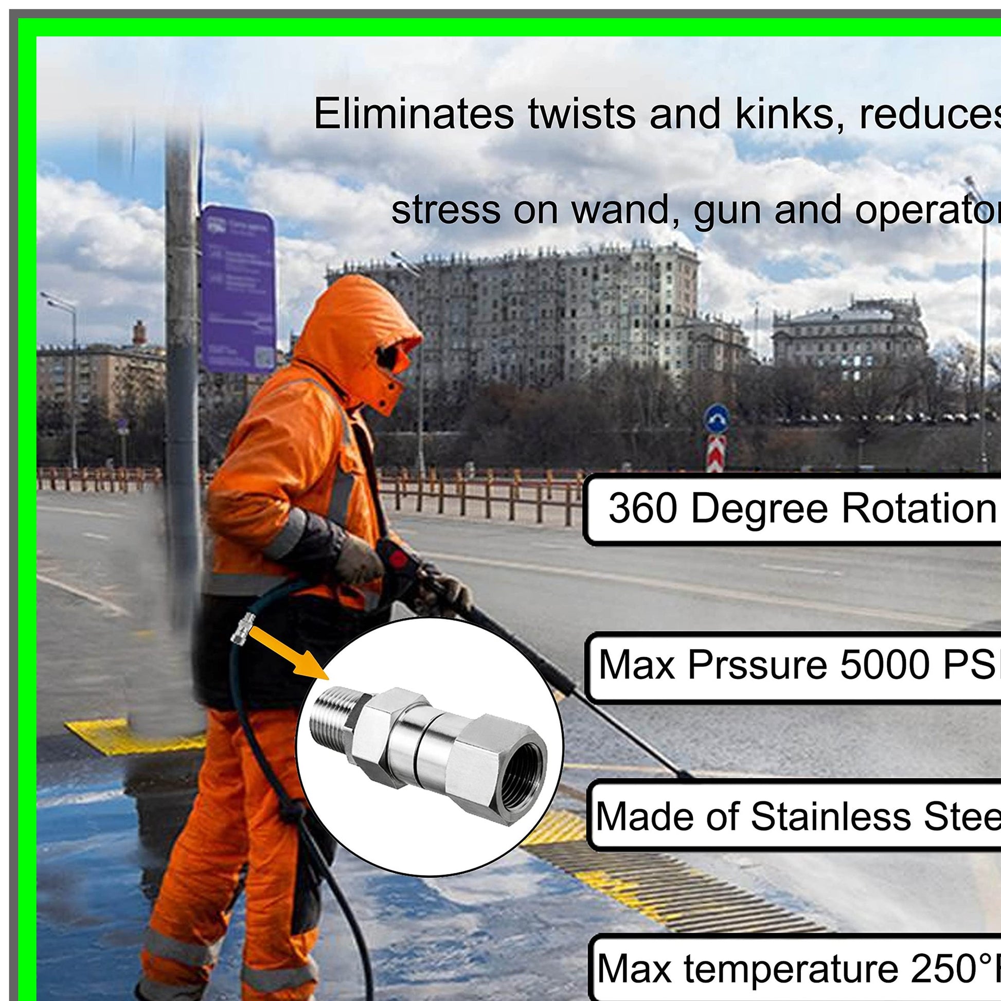 Introducing the ultimate solution for your high-pressure needs: a premium swivel connector designed to enhance your efficiency and performance. This robust connector features a 3/8 inch NPT thread, ensuring a secure and leak-free fit for your equipment. With its innovative 360-degree rotation capability, you can say goodbye to frustrating twists and kinks that often disrupt your workflow. Crafted from high-quality stainless steel, this connector is built to withstand the rigors of demanding environments. It boasts an impressive maximum working pressure of up to 5000 PSI, making it ideal for heavy-duty applications. Whether you're using it for industrial cleaning, pressure washing, or any high-pressure task, this connector is engineered to perform under pressure. Additionally, it can handle water temperatures up to 120°C (250°F), ensuring reliability even in extreme conditions. This feature not only enhances the longevity of your equipment but also reduces stress on hoses, wands, and guns, ultimately benefiting the operator as well. Perfect for professionals and DIY enthusiasts alike, this swivel connector is a must-have for anyone looking to improve their operational efficiency. Its durable construction and thoughtful design make it an essential addition to your toolkit. Upgrade your setup today and experience the difference that a high-quality swivel connector can make in your high-pressure applications. Say goodbye to hassle and hello to seamless performance!