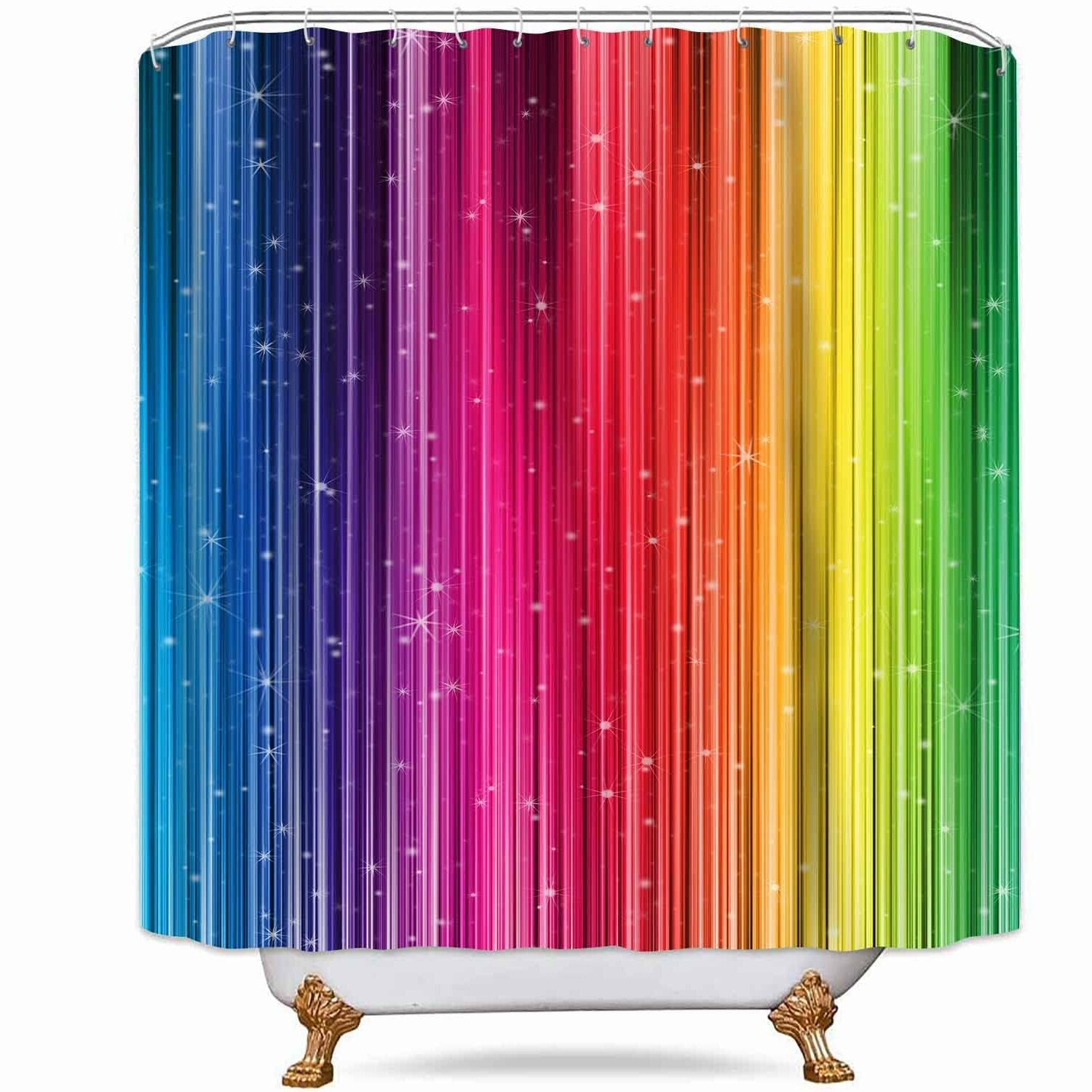 This colorful striped shower curtain measures 72 x 72 inches and is made from durable, waterproof polyester fabric. It features vivid HD digital printing with crisp lines and bright colors that won't fade, adding a lively touch to any bathroom. The curtain includes 12 free white C-type plastic hooks for easy hanging and has rust-resistant metal grommets along the reinforced top header for durability. Its weighted hem helps keep the curtain hanging evenly, while the lightweight material allows for simple use and storage. The fabric is environmentally friendly, free from irritating odors and PVC, ensuring better protection for your health. Easy to care for, it can be hand washed or machine washed in cold water and hung to dry. The curtain may arrive wrinkled due to packaging, but damp vapor will quickly smooth out the fabric. Do not bleach or iron at high temperatures. This stylish curtain brings a cheerful, positive vibe to your bathroom decor.