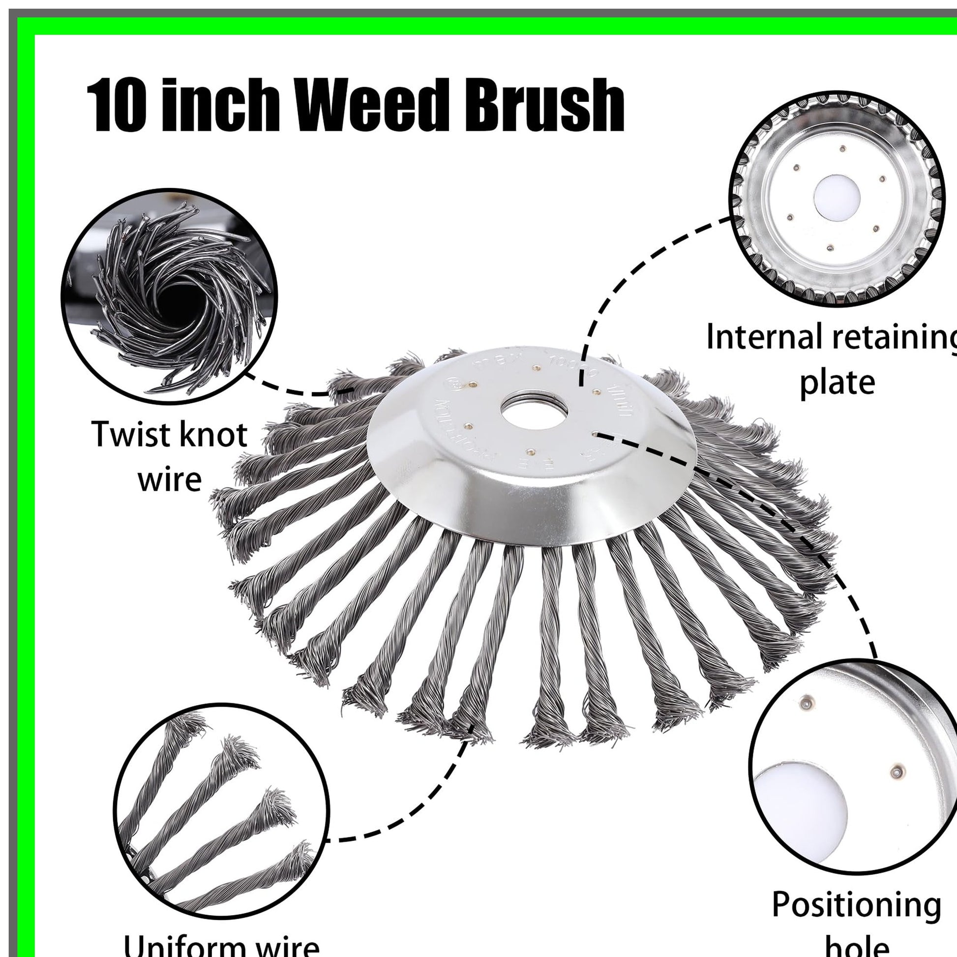Transform your gardening experience with our 10-Inch Rotary Steel Wire Brush Cutter Trimmer Head Blade. Designed for efficiency and durability, this versatile tool is perfect for tackling tough overgrowth, moss, and rust removal. Its robust steel construction ensures long-lasting performance, making it an essential addition to your lawn care arsenal.Equipped with a universal adapter kit, this brush cutter head is compatible with a wide range of string trimmers, including popular models from leading brands. Whether you're a professional landscaper or a weekend warrior, this tool will help you achieve a pristine garden effortlessly. The 10-inch diameter allows for a broader cutting area, reducing the time spent on maintenance while delivering precise results.Ideal for clearing weeds, thick grass, and unwanted vegetation, this brush cutter head is engineered to handle the toughest jobs. The innovative design minimizes vibration, providing a smoother operation and enhancing user comfort during extended use. Say goodbye to manual labor and hello to a more efficient way of maintaining your outdoor spaces.Perfect for both residential and commercial use, this brush cutter head is a game-changer for anyone looking to elevate their gardening tasks. Its lightweight yet sturdy build ensures easy maneuverability, while the sharp steel wires effectively cut through even the most stubborn growth.Upgrade your lawn care toolkit with our 10-Inch Rotary Steel Wire Brush Cutter Trimmer Head Blade and experience the difference in performance and ease of use. Whether you're preparing your garden for the season or maintaining its beauty year-round, this tool is your go-to solution for all your trimming needs. Get ready to enjoy a beautifully manicured landscape with minimal effort!