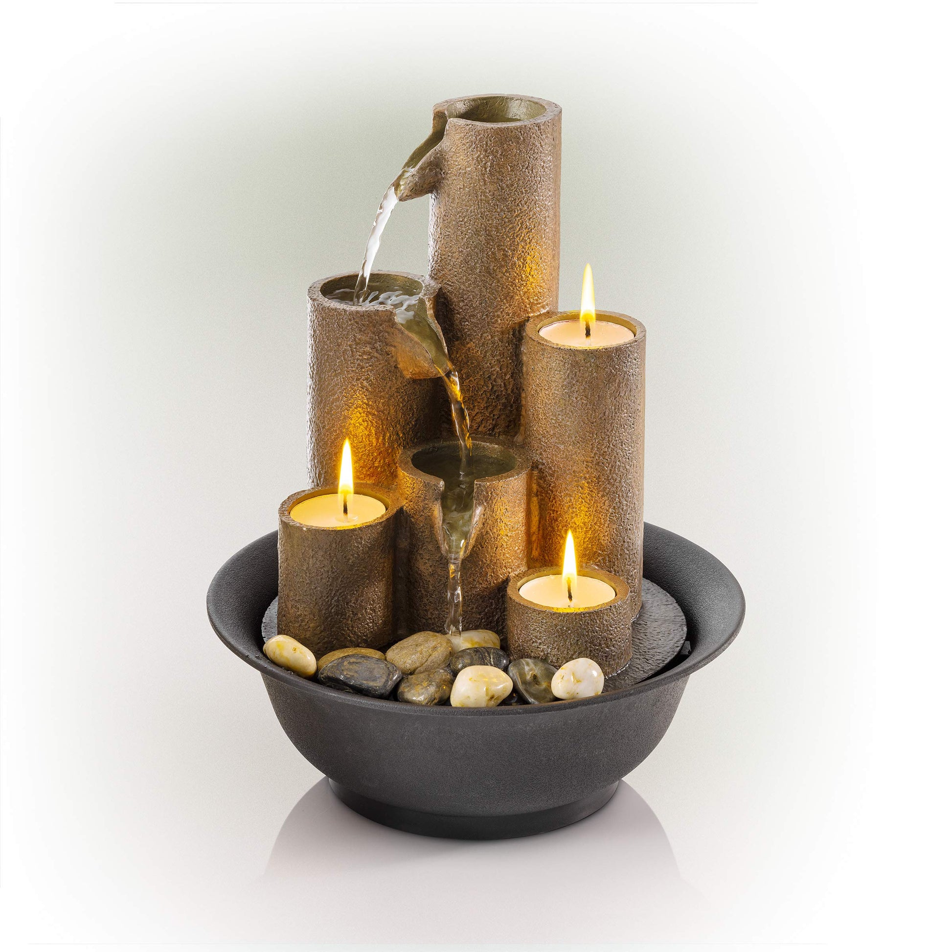 Tiered Column Tabletop Fountain with 3 Candles, Mini Waterfall for Indoor Spaces, Relaxation Water Feature, 11" Tall, Brown